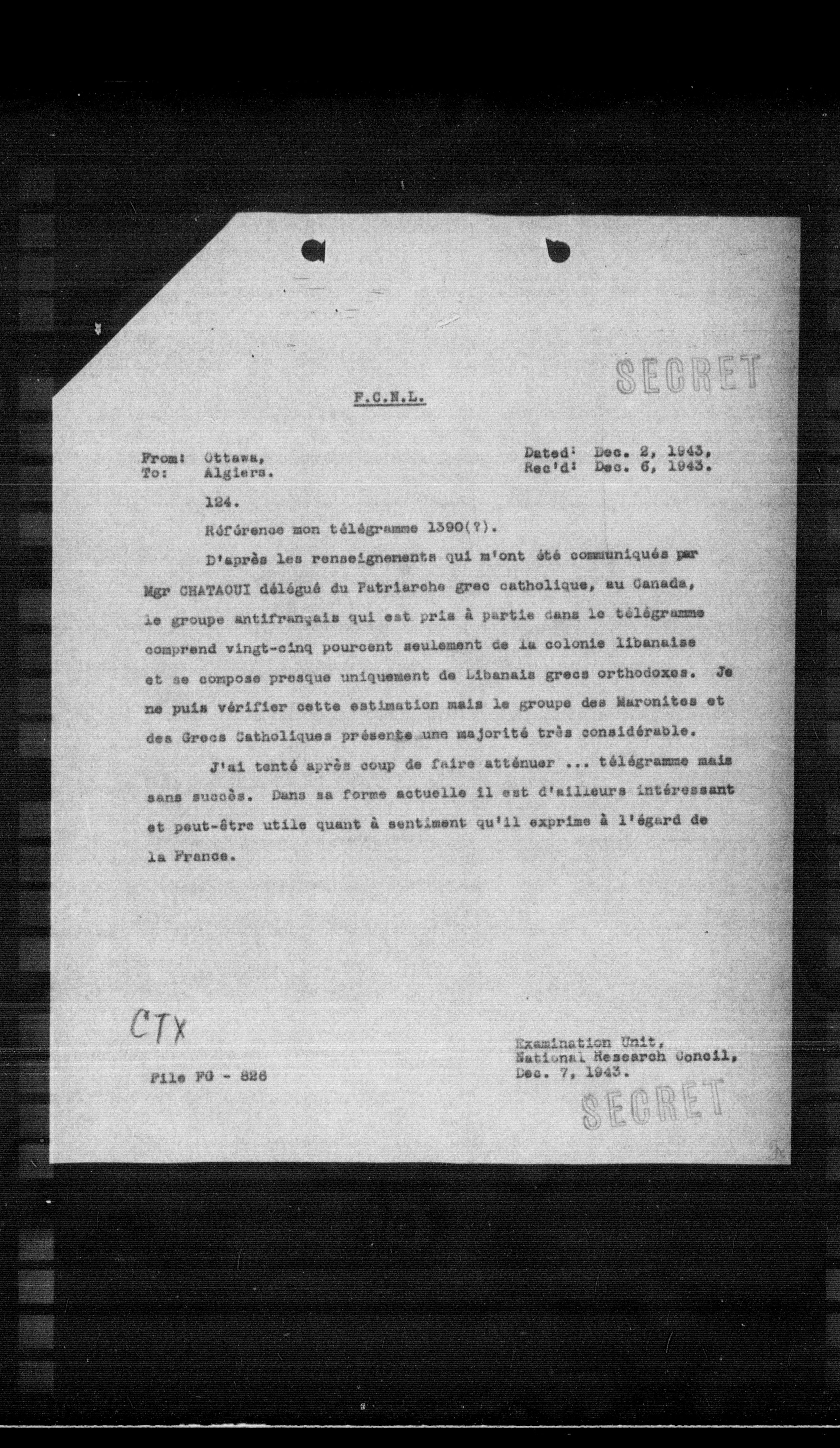 D'après les renseignements qui m'ont été communiqués par Mgr CHATAOUI délégué du Patriarche grec catholique, au Canada, le groupe antifrançais qui est pris à partie dans le télégramme comprend vingt-cinq pouroent seulement de la colonie libanalse et se compose presque uniquement de Libanais grecs orthodoxes. Je ne puis vérifier cette estimation mais le groupe des Maronites et des Grecs Catholiques présente une majorité très considérable.