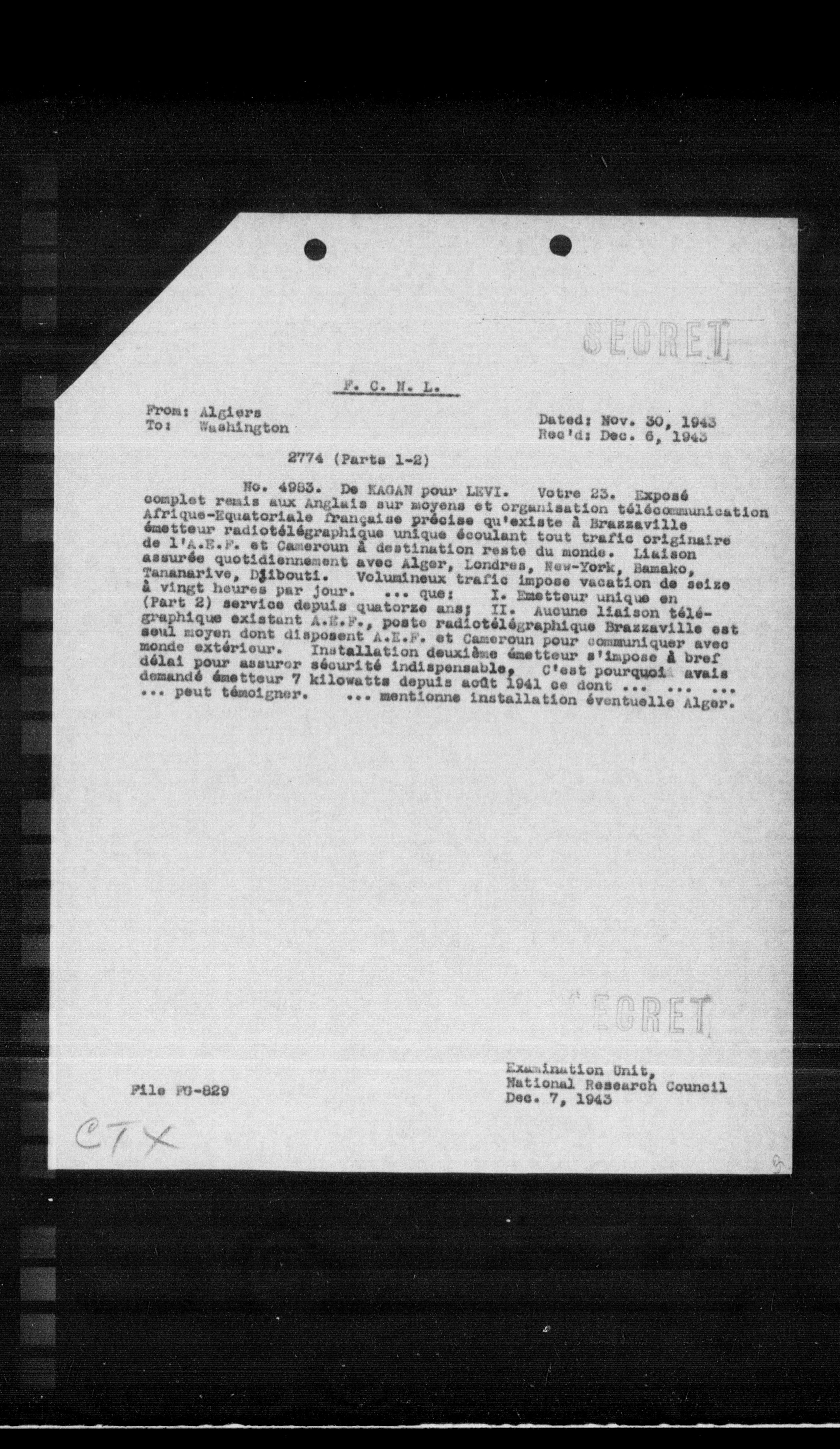 No. 4983. De KAGAN pour LEVI. Votre 23. Exposé complet remis aux anglais sur moyens et organisation telécommunication Afrique-Equatoriale française précise qu'existe à Brazzaville émetteur radiotélégraphique unique écoulant tout trafic originaire de $1^{1} \mathrm{~A} . \mathrm{H} . \mathrm{F}$. et Cameroun à destination reste du monde. Liaison assurée quotidiennement avec Alger, Londres, New-York, Bamako, Tananarive, Djibouti. Volumineux trafic impose vacation de seize a vingt heures par jour. ... que: I. Emetteur unique en (Part 2) service depuis quatorze ans; II. Aucune liaison télégraphique existant A.E.F., poste radiotélégraphique Brazzaville est seul moyen dont disposent A.E.F. et Cameroun pour communiquer avec monde extérieur. Installation deuxième émetteur s'impose a bref délai pour assurer sécurité indispensable. C'est pourquoi: avais demandé émetteur 7 kilowatts depuis août 1941 ce dont ... ... ... ... peut témoigner. ... mentionne installation éventuelle Alger.
