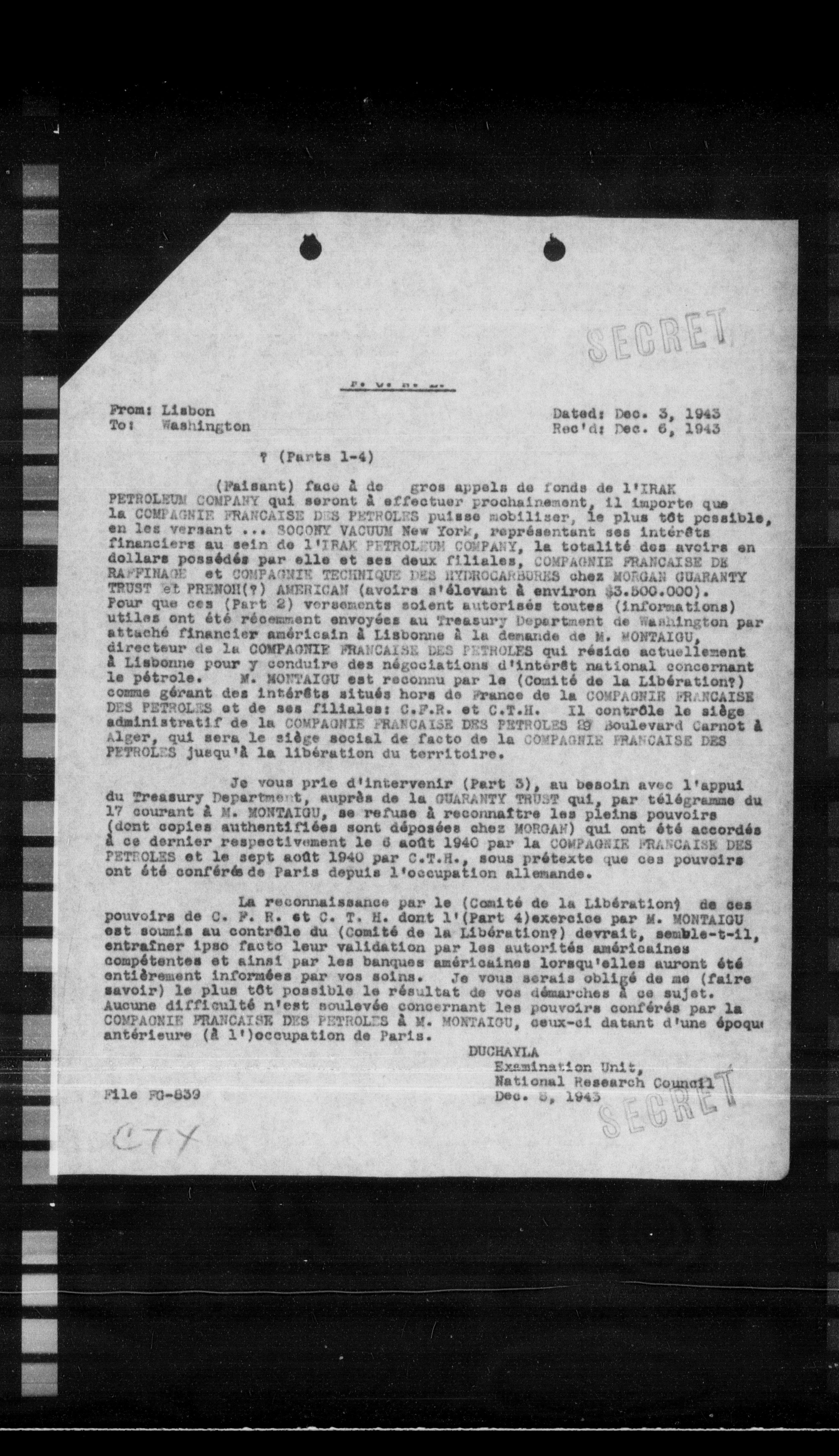 (Paisant) face à de gros appels de fonds de l'IRAE PETROLEUM COMPANY qui seront à effectuer prochainement, il importe que la COMPAGNIE FRANCAISE DES PETROLES puisse mobiliser, le plus tôt possible, en les versant ... SOGOMT VACUUN New York, représentant ses intérêts financiers au sein de l'IRAE PETROLEUM COMPANY, la totalité des avoirs en dollars possédés par elle et ses deux filiales, COMPAGNIE FRANCAISE DE RAPPIRADE et COMPAGNIE TECHNIQUE DES HYDROCARBONES chez MORGAN GUARANTY TRUST et PREBOU(?) AMERICAN (avoirs s'élevant à environ 35.500.000). Pour que ces (Part 2) versements soient autorisés toutes (informations) utiles ont été récemment envoyées au Treasury Department de Washington par attaché financier américain à Lisbonne à la demande de M. MONTAIGU, directeur de la COMPAGNIE FRANCAISE DES PETROLES qui réside actuellement à Lisbonne pour y conduire des négociations d'intérêt national concernant le pétrole. M. MONTAIGU est reconnu par le (Comité de la Libération) comme gérant des intérêts situés hors de France de la COMPAGNIE FRANCAISE DES PETROLES et de ses filiales: C.P.R. et C.T.H. Il contrôle le siège administratif de la COMPAGNIE FRANCAISE DES PETROLES US Boulevard Carnot à Alger, qui sera le siège social de facto de la COMPAGNIE FRANCAISE DES PETROLES jusqu'à la libération du territoire.