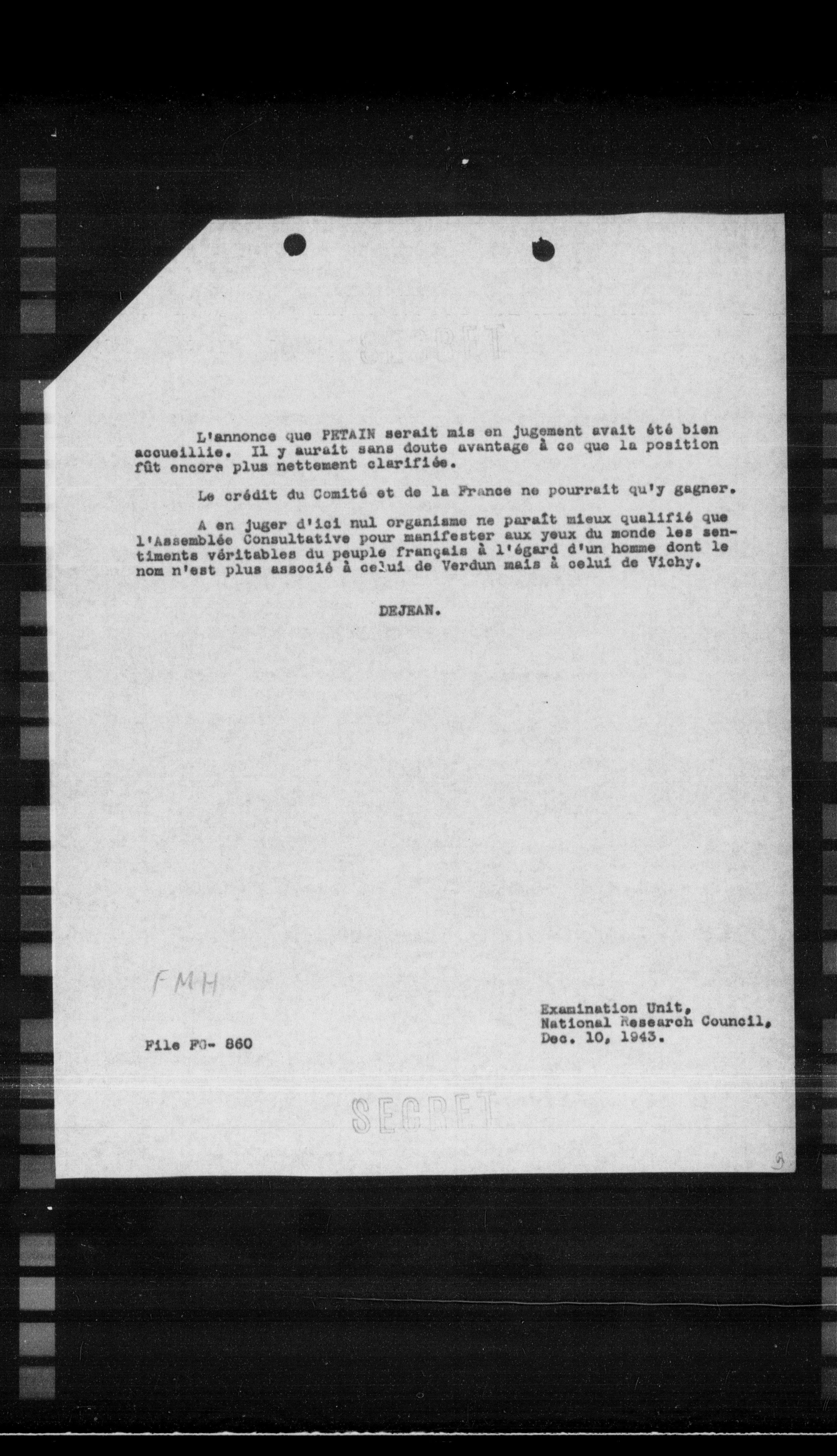 A en juger d'ici nul organisme ne parait mieux qualifié que l'Assemblée Consultative pour manifester aux yeux du monde les sentiments véritables du peuple français à l'égard d'un homme dont le nom n'est plus associé à celui de Verdun mais à celui de Vichy.