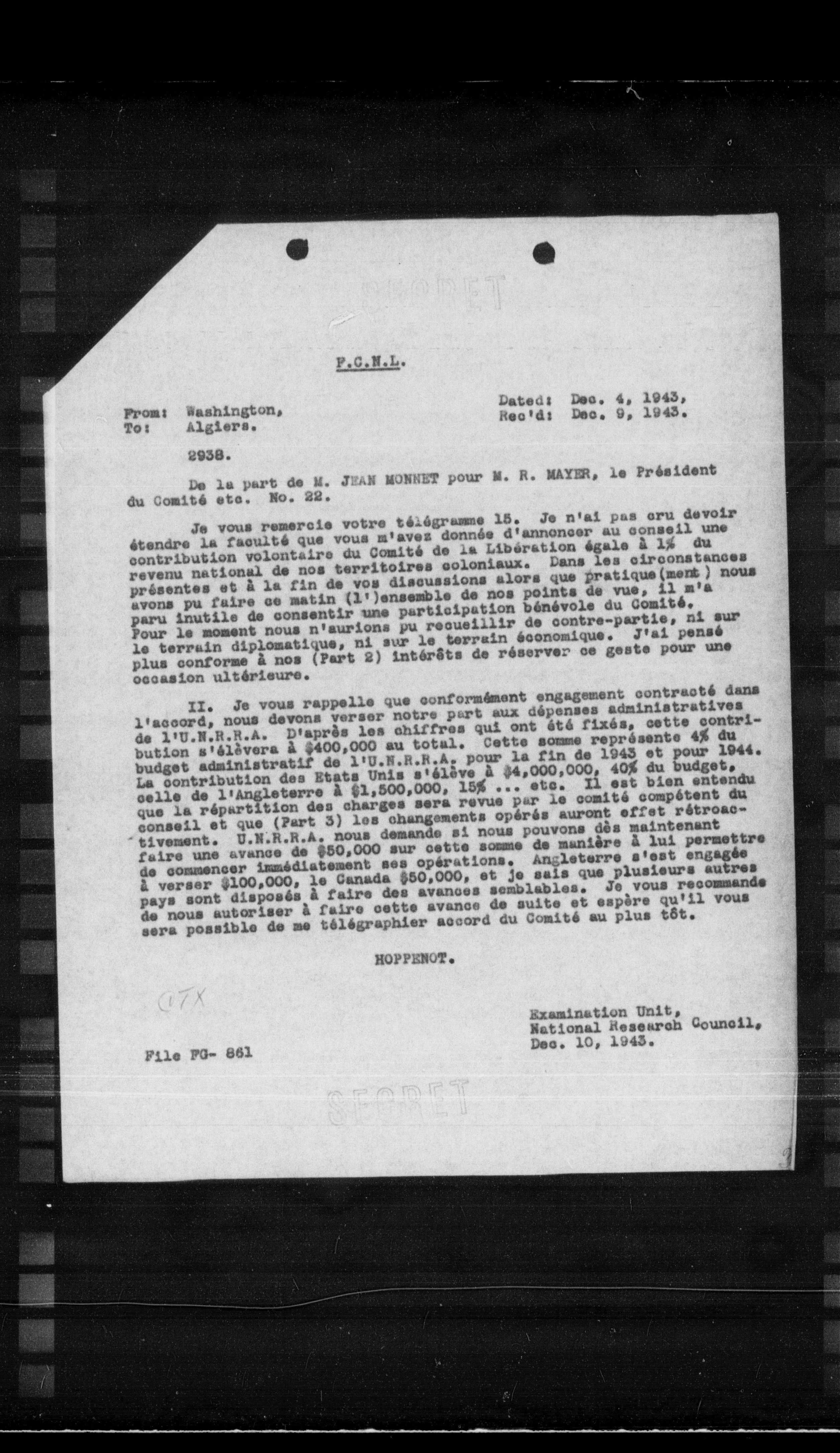 II. Je vous rappelle que conformément engagement contrasté dans l'accord, nous devons verser notre part aux dépenses administratives de l'U.N.R.R.A. D'après les chiffres qui ont été fixés, cette contribution s'élève à $400,000 au total. Cette somme représente 4% du budget administratif de l'U.N.R.R.A. pour la fin de 1943 et pour 1944. La contribution des Etats Unis s'élève à $4,000,000, 40% du budget, celle de l'Angleterre à $1,500,000, 15% etc. Il est bien entendu que la répartition des charges sera revue par le comité compétent du conseil et que (Part 3) les changements opérés auront effet rétroactivement. U.N.R.R.A. nous demande si nous pouvons dès maintenant faire une avance de $50,000 sur cette somme de manière à lui permettre de commencer immédiatement ses opérations. Angleterre s'est engagée à verser $100,000, le Canada $50,000, et je sais que plusieurs autres pays sont disposés à faire des avances semblables. Je vous recommande de nous autoriser à faire cette avance de suite et espère qu'il vous sera possible de me télégraphier accord du Comité au plus tôt.