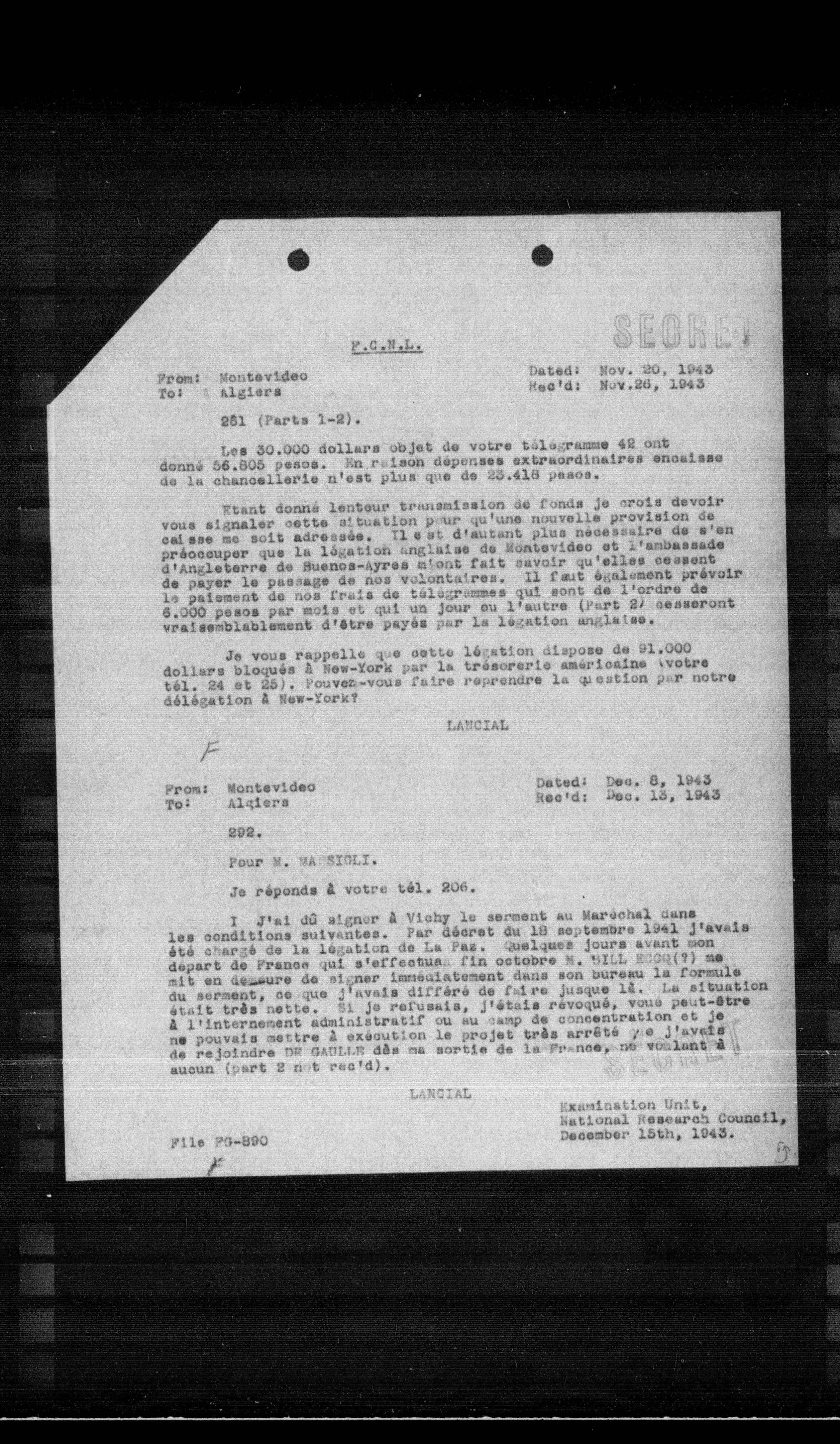 I J'ai dû signer à Vichy le serment au Maréchal dans les conditions suivantes. Par décret du 18 septembre 1941 j'avais été chargé de la légation de La Paz. Quelques jours avant mon départ de France, qui s'effectue, j'in octobre M. WILL ROG (?) me mit en demeure de signer immédiatement dans son bureau la formule du serment, ce que j'avais différé de faire jusque là. La situation était très nette. Si je refusais, j'étais révoqué, vous peut-être à l'internement administratif ou au camp de concentration et je ne pouvais mettre à exécution le projet très arrêté que j'avais de rejoindre DE GARLLE dès ma sortie de la France, ne voulant à aucun (part 2 n° rec'd).
