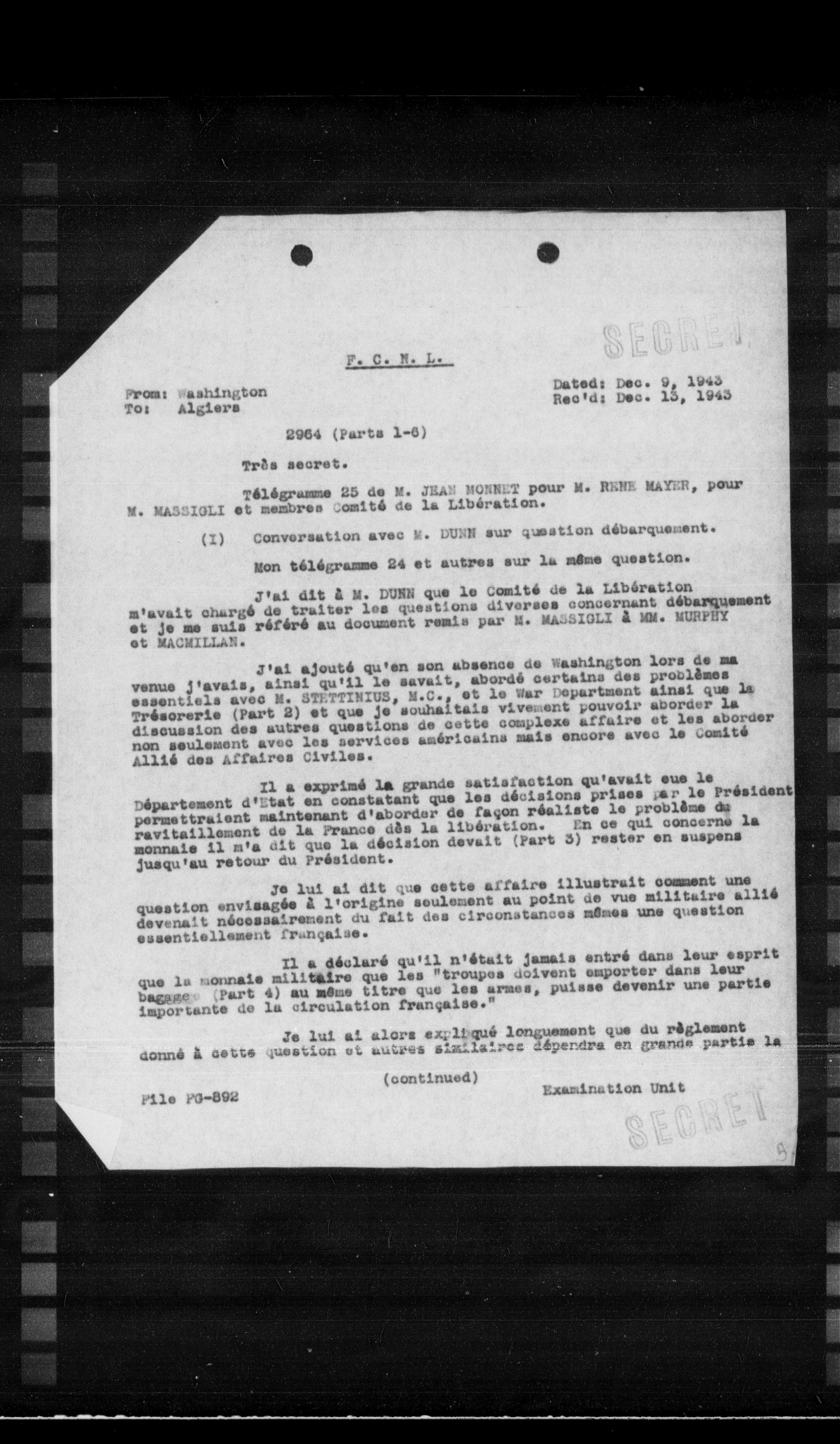 Il a exprimé la grande satisfaction qu'avait eue le Département d'Etat en constatant que les décisions prises par le Président permettraient maintenant d'aborder de façon réaliste le problème du ravitaillement de la France dès la libération. En ce qui concerne la monnaie il m'a dit que la décision devait (Part 3) rester en suspens jusqu'au retour du Président.
