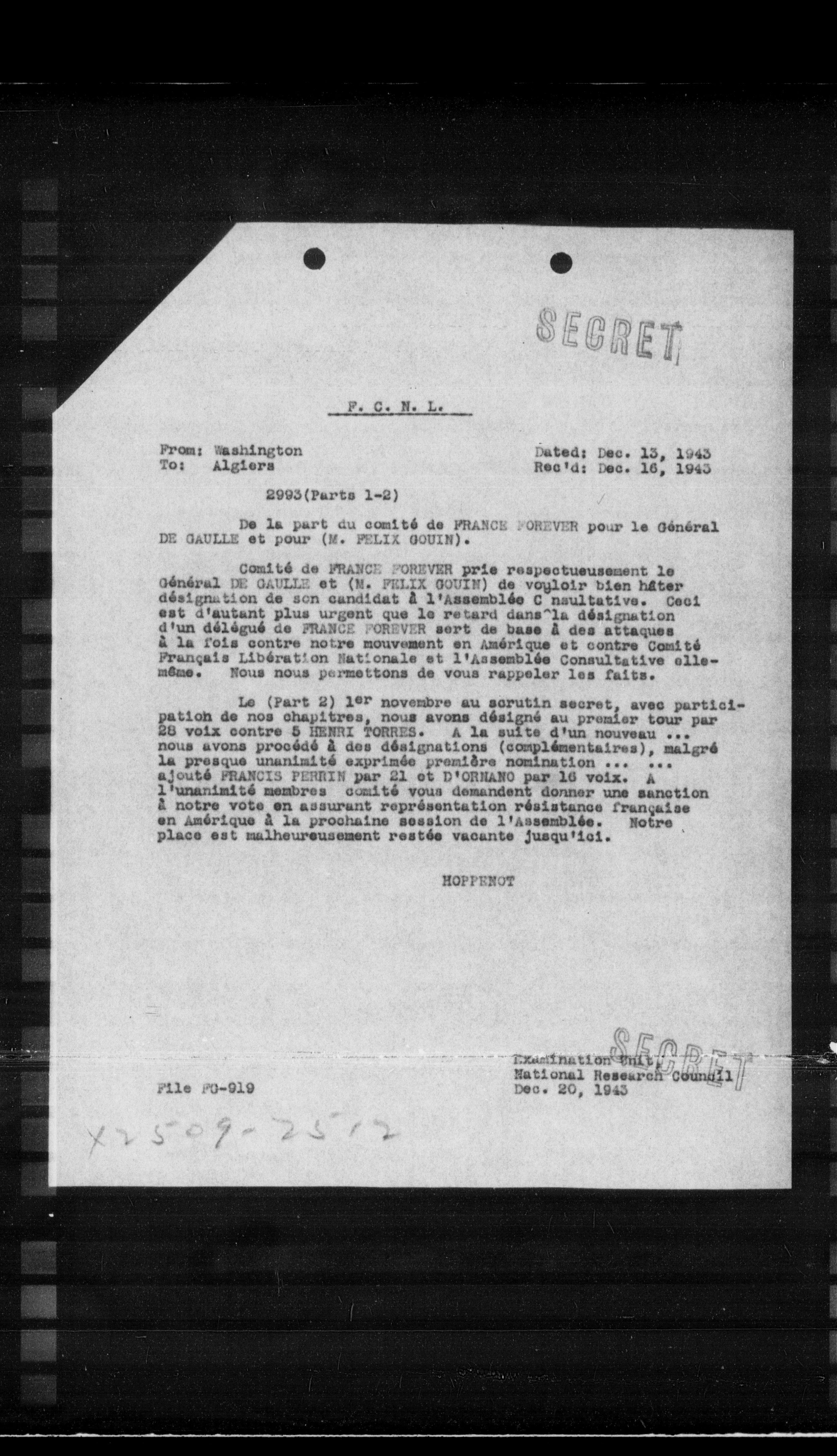 Comité de FRANCE FOREVER prie respectueusement le général DE GAULLE et (M. FELIX GOUIN) de vouloir bien hâter désignation de son candidat à l'Assemblée Consultative. Ceci est d'autant plus urgent que le retard dans la désignation d'un délégué de FRANCE FOREVER sert de base à des attaques à la fois contre notre mouvement en Amérique et contre Comité Français Libération Nationale et l'Assemblée Consultative elle-même. Nous nous permettons de vous rappeler les faits.