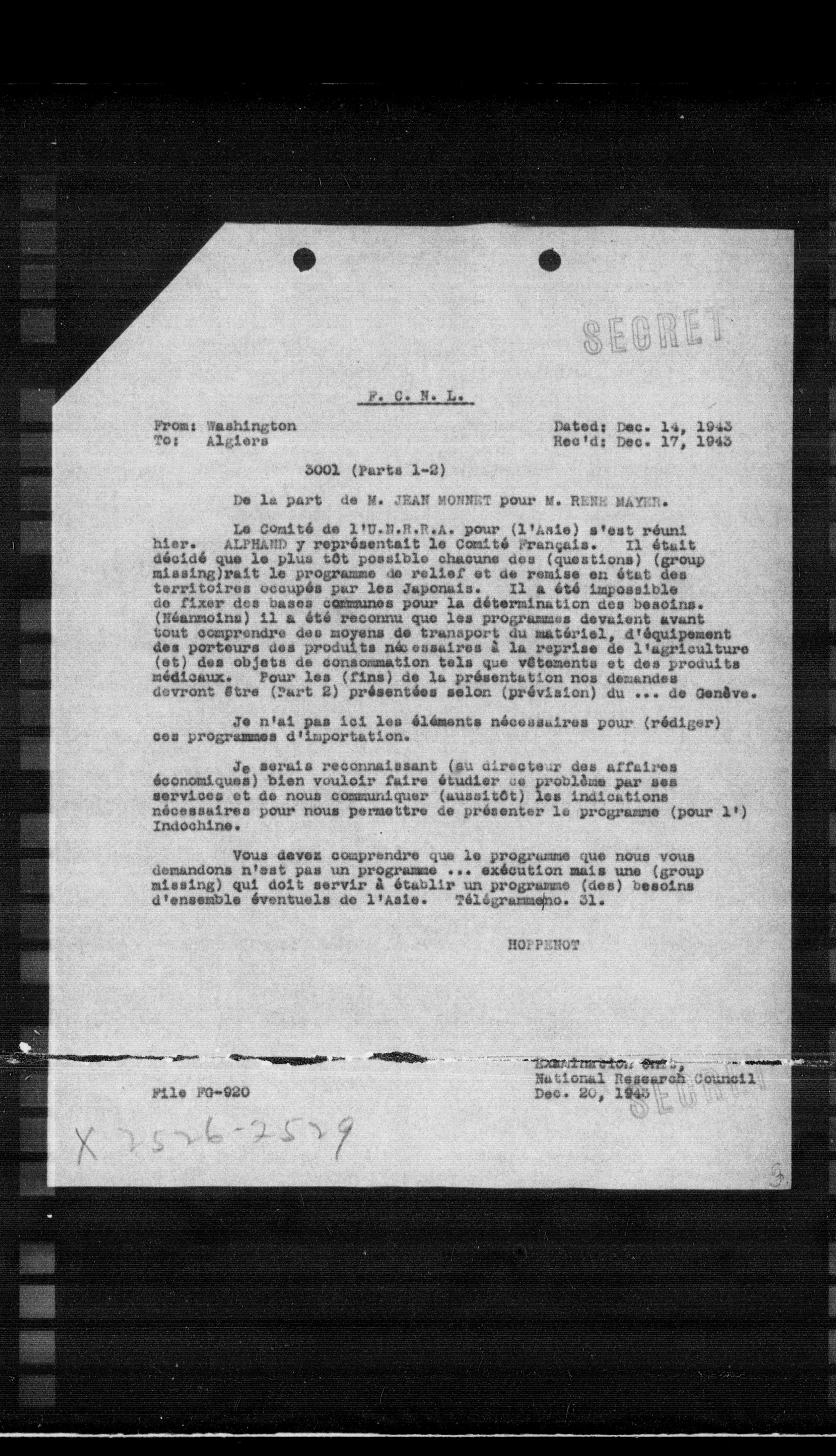 Le Comité de l'U.S.R.S.A. pour (l'Asie) s'est réuni hier. ALFRAND y représentait le Comité Français. Il était décidé que le plus tôt possible chacune des (questions) (group missing)rait le programme de relief et de remise en état des territoires occupés par les Japonais. Il a été impossible de fixer des bases communes pour la détermination des besoins. (Séanmoins) il a été reconnu que les programmes devaient avant tout comprendre des moyens de transport du matériel, d'équipement des porteurs des produits nécessaires à la reprise de l'agriculture (et) des objets de consommation tels que vêtements et des produits médicaux. Pour les (fine) de la présentation nos demandes devront être (Part 2) présentées selon (prévision) du ... de Genève.