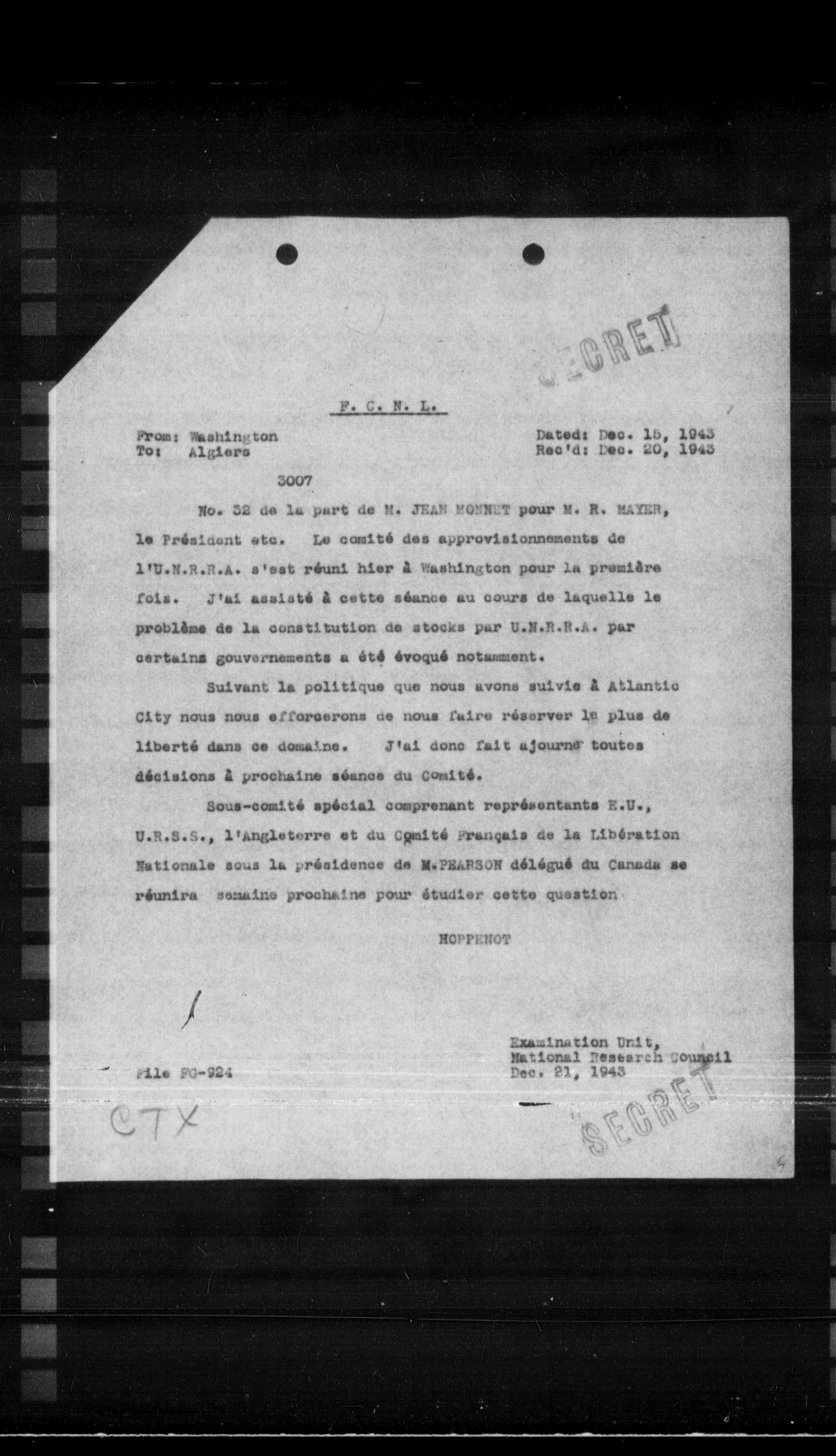 Sous-comité spécial comprenant représentants E.U., U.R.S.S., l'Angleterre et du Comité Français de la Libération Nationale sous la présidence de M. THARSON délégué du Canada se réunira semaine prochaine pour étudier cette question.