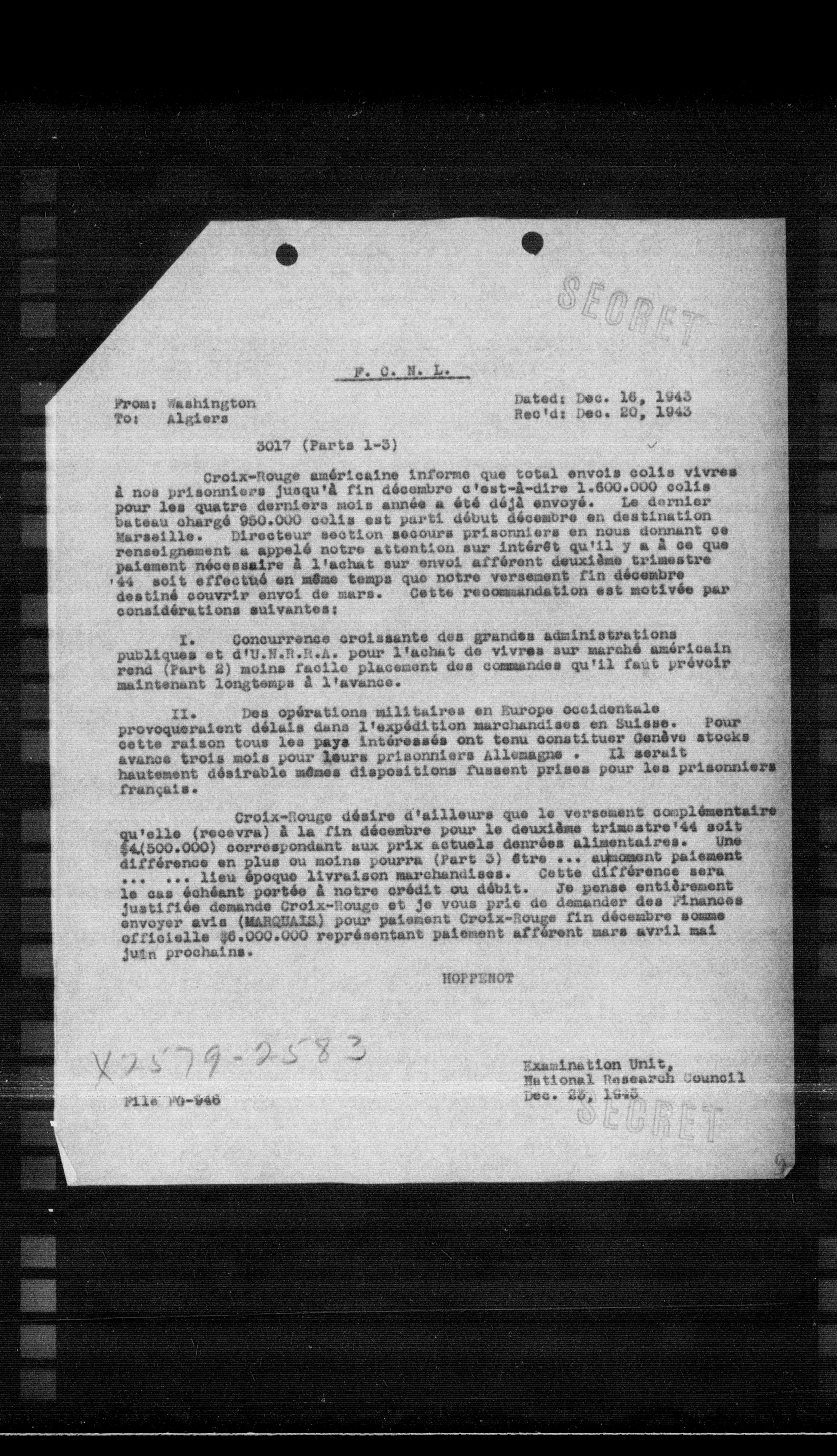 Croix-Nouge américaine informe que total envois colis vivres à nos prisonniers jusqu'à fin décembre c'est-à-dire 1.600.000 colis pour les quatre derniers mois annés a été déjà envoyé. Le dernier bateau chargé 950.000 colis est parti début décembre en destination Marseille. Directeur section secours prisonniers en nous donnant ce renseignement a appelé notre attention sur intérêt qu'il y a à ce que paiement nécessaire à l'achat sur envoi afférent deuxième trimestre '44 soit effectué en même temps que notre versement fin décembre destiné couvrir envoi de mars. Cette recommandation est motivée par considérations suivantes: