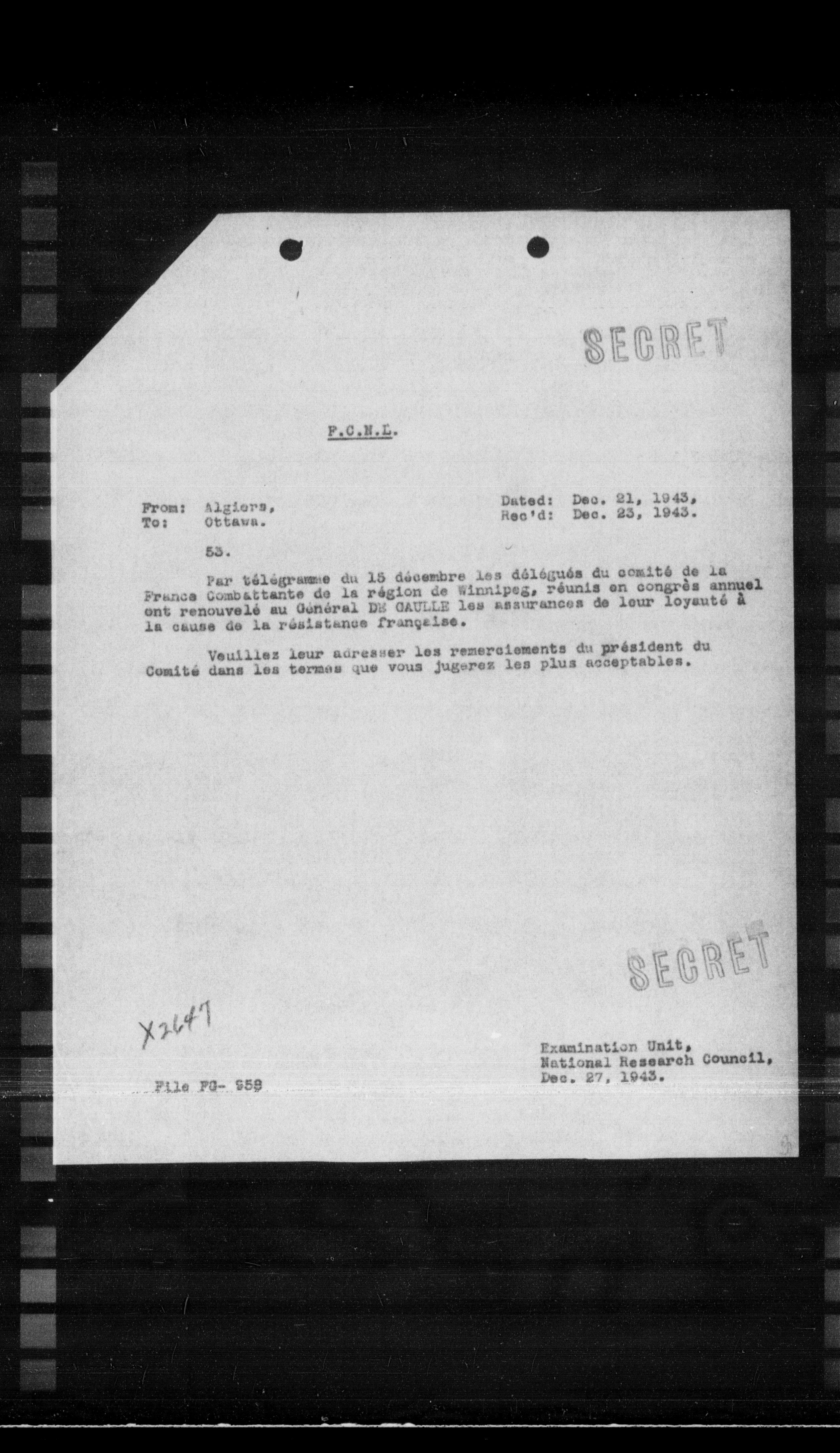 Par téléphone ce 15 décembre les délégués du comité de la France Comptante de la région de Winnipeg, réunis en congrès annuel ont renouvelé au Général DU GAULLE les assurances de leur loyauté à la cause de la résistance française.