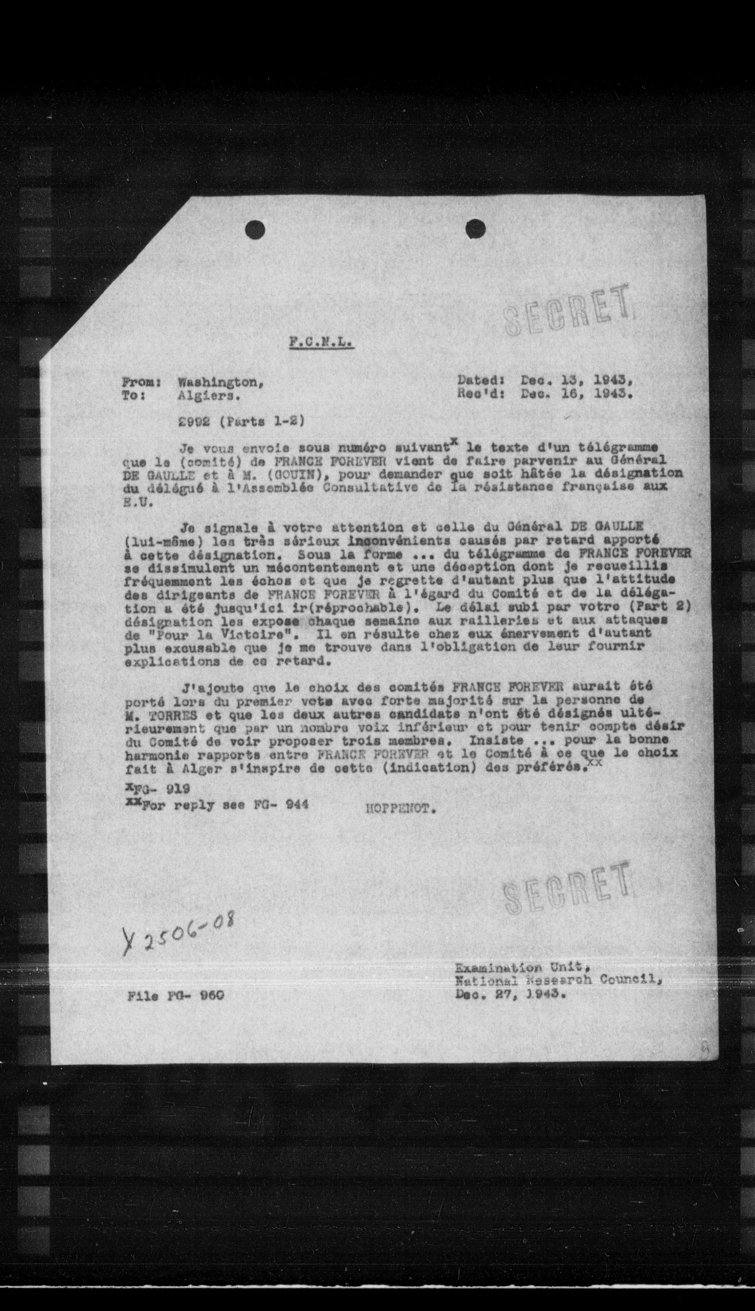 Je signale à votre attention et celle du Général DE GAULLE (lui-même) les très sérieux inconvénients causés par retard apporté à cette désignation. Sous la forme du télégramme de FRANCE FOREVER se dissimulent un mécontentement et une déception dont je recueillis fréquemment les échos et que je regrette d'autant plus que l'attitude des dirigeants de FRANCE FOREVER à l'égard du Comité et de la délégation a été jusqu'ici irréprochable. Le délai subi par votre (Part 2) désignation les expose chaque semaine aux railleries et aux attaques de "Pour la Victoire". Il en résulte chez eux énormément d'autant plus excusable que je me trouve dans l'obligation de leur fournir explications de ce retard.