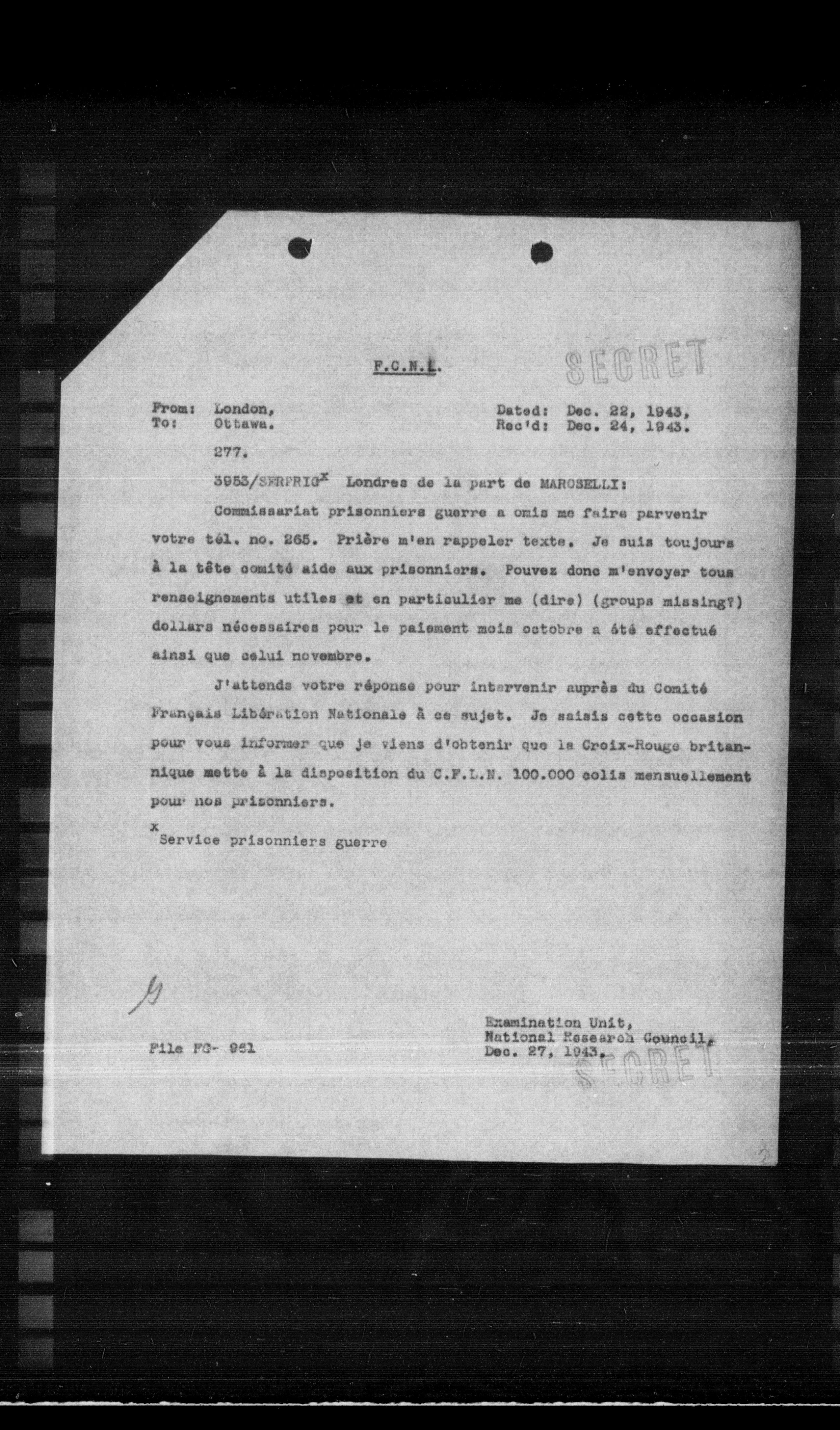 From: London, Dated: Dec. 22, 1943, To: Ottawa. Ree'd: Dec. 24, 1943. 277.