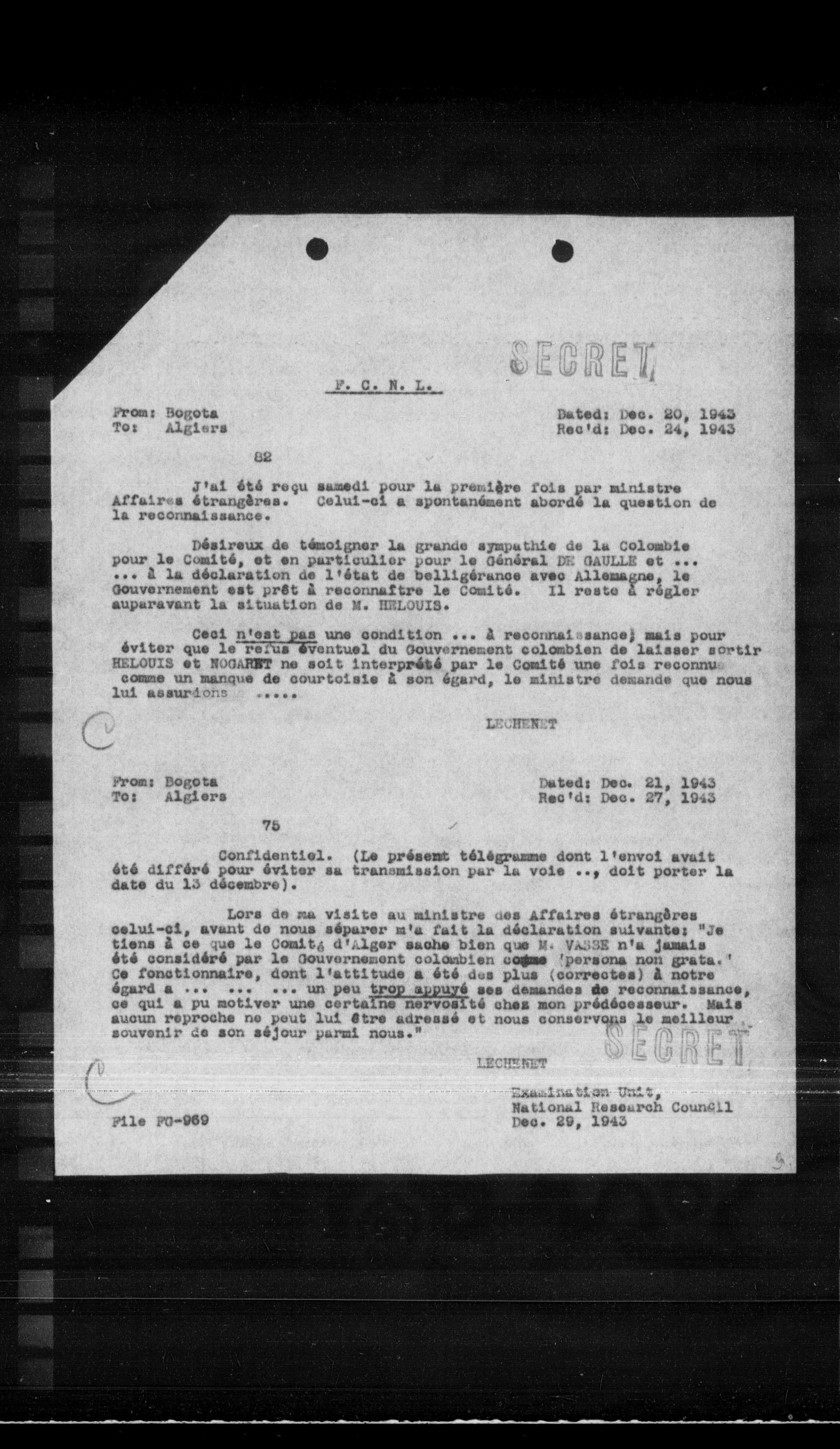Ceci n'est pas une condition ... à reconnaissance; mais pour éviter que le refus éventuel du Gouvernement colombien de laisser sortir HELOUIS et NOGARNT ne soit interprété par le Comite une fois reconnus comme un manque de courtoisie à son égard, le ministre demande que nous lui assurdoins