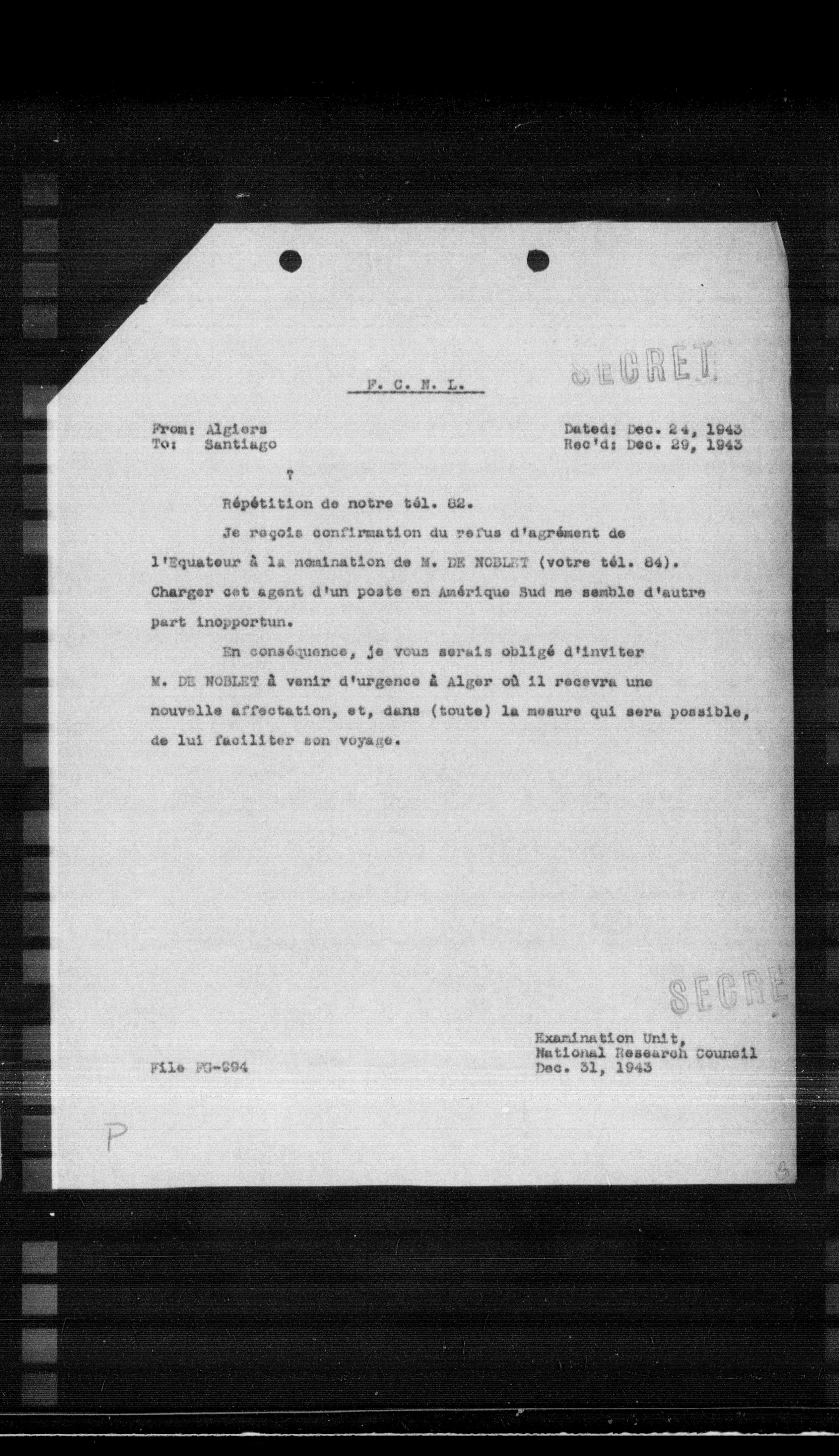 En conséquence, je vous serais obligé d'inviter M. DE NOBLET à venir d'urgence à Alger où il recevra une nouvelle affectation, et, dans (toute) la mesure qui sera possible, de lui faciliter son voyage.