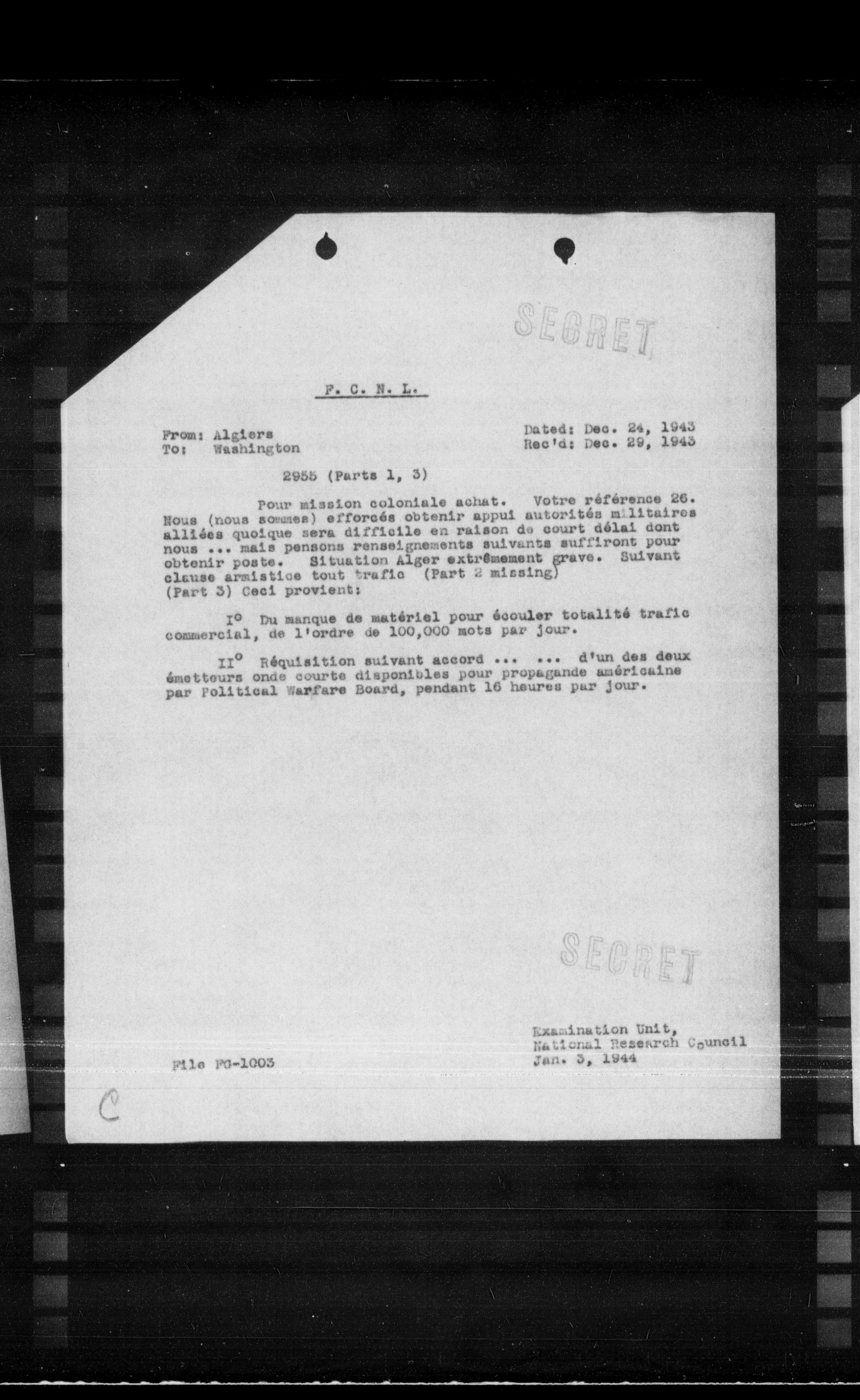 Nous (nous sommes) efforcés obtenir appui autorités militaires alliées quoique sera difficile en raison de court délai dont nous mais pensons renseignements suivants suffiront pour obtenir poste. Situation Alger extrêmement grave. Suivant clause armistice tout trafic (Part 2 missing) (Part 3) Ceci provient: