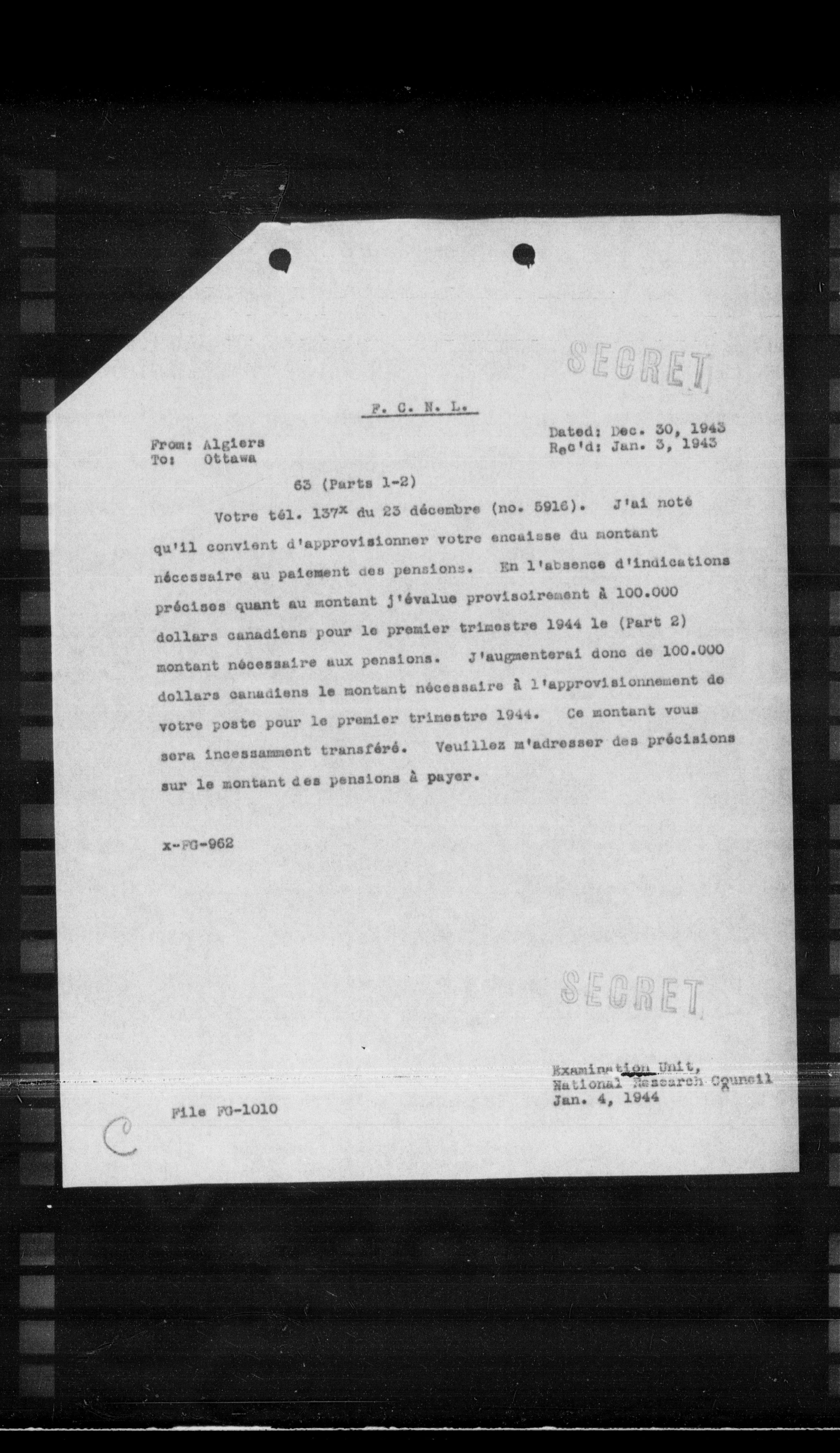 Votre tôl. $137^{\circ} \mathrm{x}$ du 23 décembre (no. 5916). J'ai noté qu'il convient d'approvisionner votre encaiese du montant nécessaire au paiement ces pensions. En l'absence d'indications précises quant au montant j'évalue provisoirement à 100.000 dollars canadiens pour le premier trimestre 1944 le (Part 2) montant nécessaire aux pensions. J'augmenterai donc de 100.000 dollars canadiens le montant nécessaire à l'approvisionnement de votre poste pour le premier trimestre 1944. Ce montant vous sera incessamment transféré. Veuillez m'adresser des précisions sur le montant des pensions à payer.