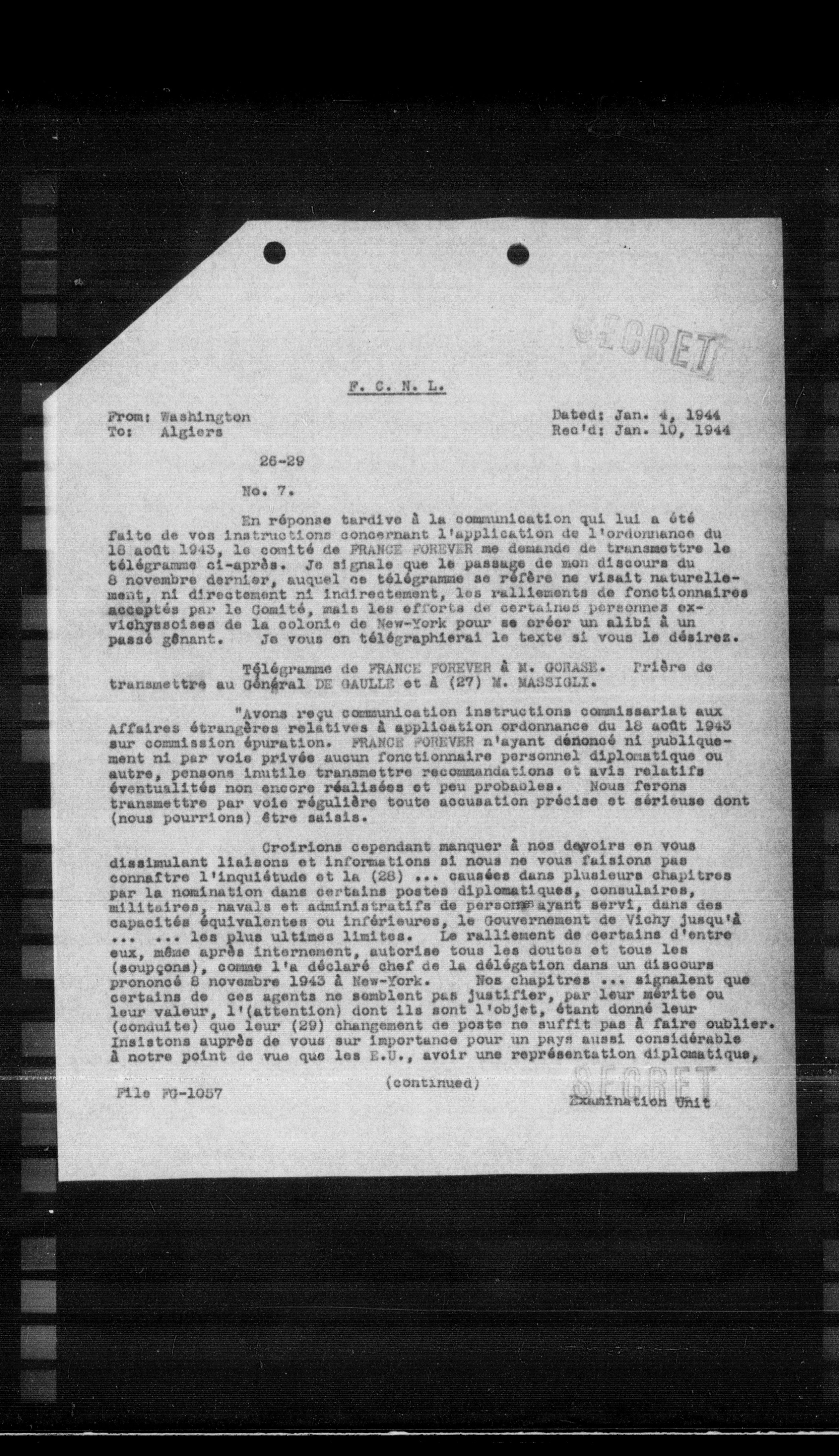"Avons reçu communication instructions commissariat aux affaires étrangères relatives à application ordonnance du 10 août 1943 sur commission épuration. FRANCE FOREVER n'ayant dénoncé ni publiquement ni par voie privée aucun fonctionnaire personnel diplomatique ou autre, pensons inutile transmettre recommandations et avis relatifs éventualités non encore réalisées et peu probables. Nous ferons transmettre par voie régulière toute accusation précise et sérieuse dont (nous pourrions) être saisis.