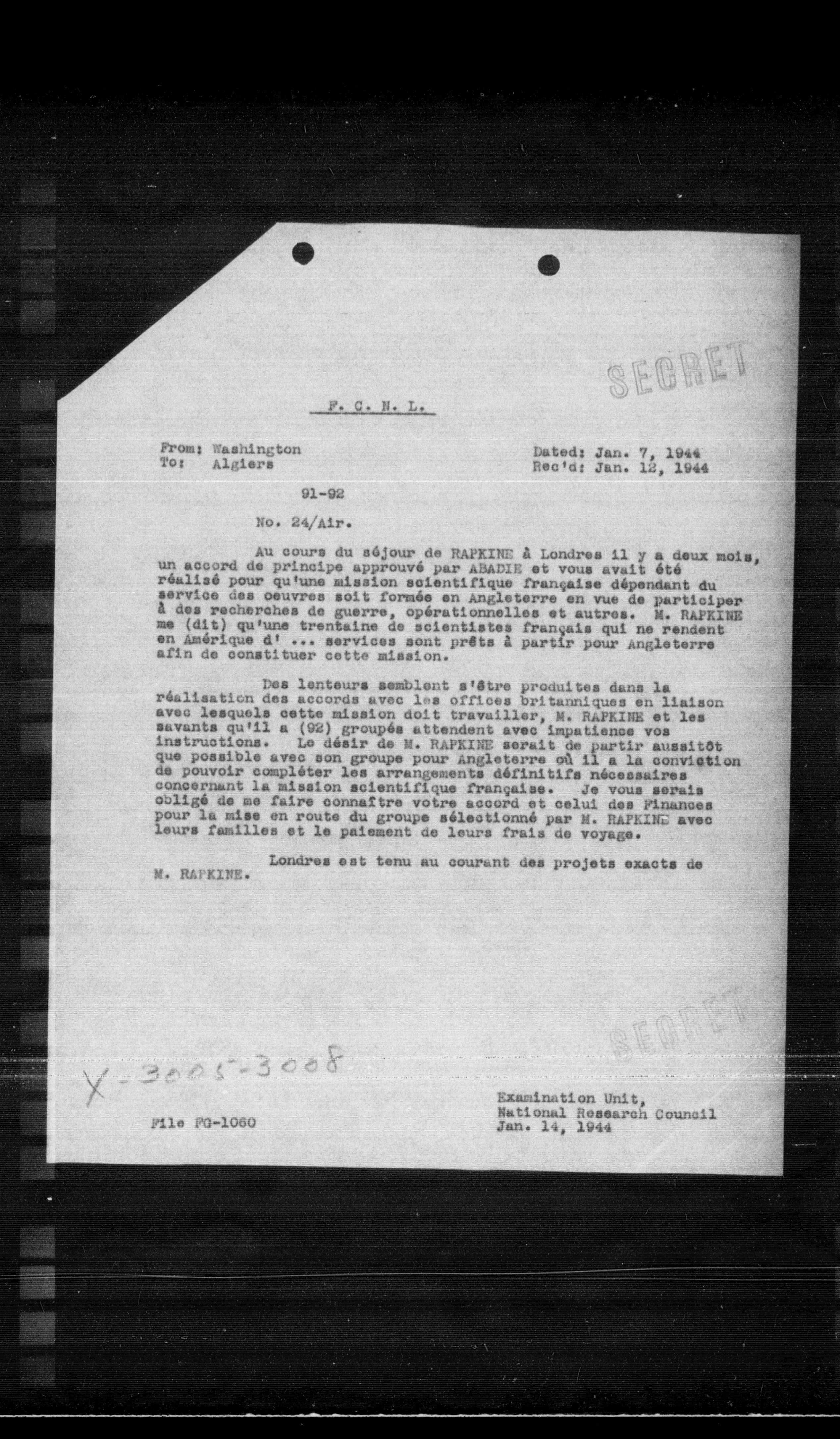 Des lenteurs semblent s'être produites dans la réalisation des accords avec les offices britanniques en liaison avec lesquels cette mission doit travailler, M. RAPEINE et les savants qu'il a (92) groupés attendent avec impatience vos instructions. Le désir de M. RAPEINE serait de partir aussitôt que possible avec son groupe pour Angleterre où il a la conviction de pouvoir compléter les arrangements définitifs nécessaires concernant la mission scientifique française. Je vous serais obligé de me faire connaître votre accord et celui des Finances pour la mise en route du groupe sélectionné par M. RAPEINE avec leurs familles et le paiement de leurs frais de voyage.