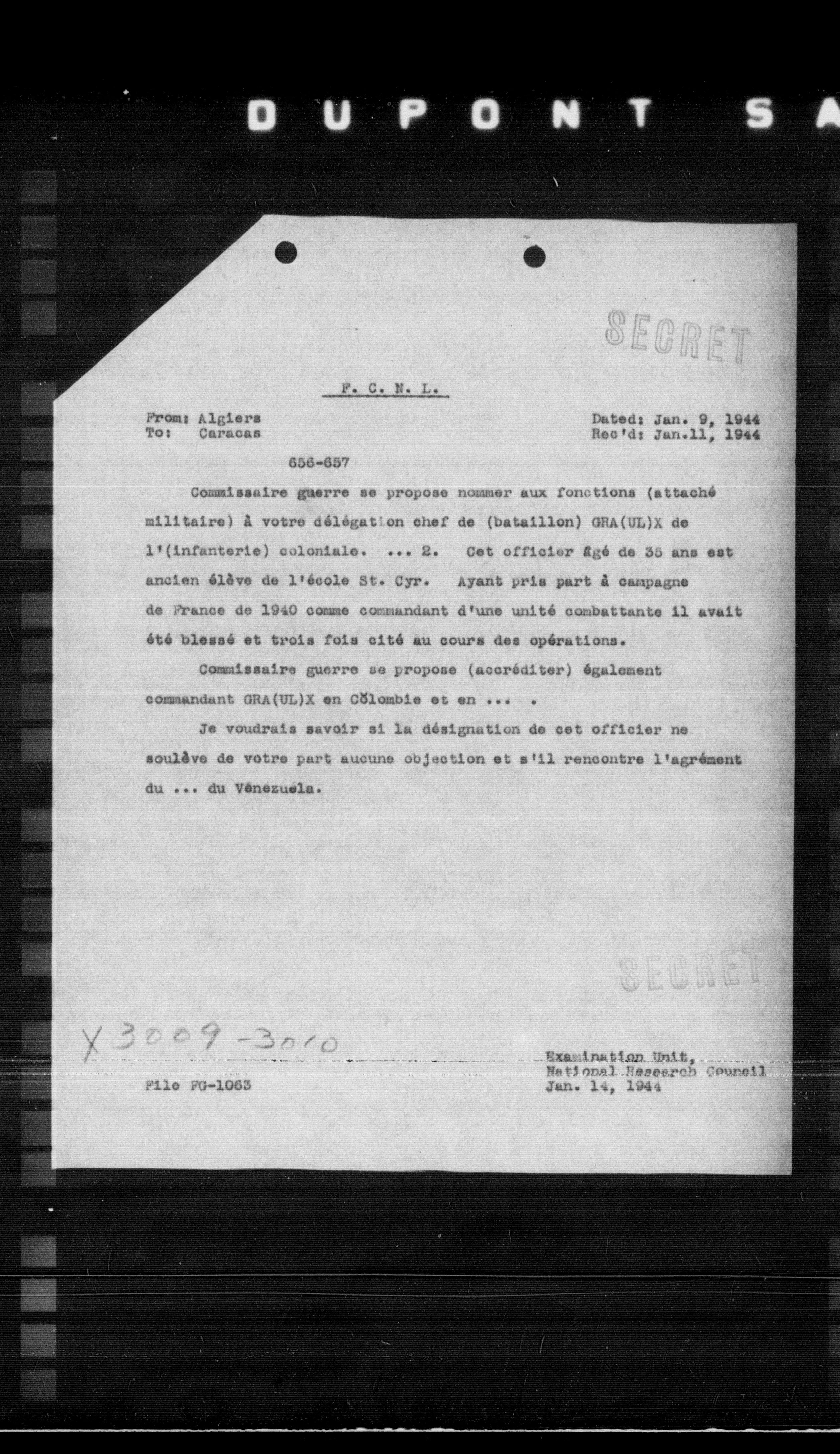 Commissaire guerre se propose nommer aux fonctions (attaché militaire) à votre délégation chef de (bataillon) GRA (UL)X de 1'(infanterie) coloniale. ... 2. Cet officier âgé de 35 ans est ancien élève de l'école St. Cyr. Ayant pris part à campagne de France de 1940 comme commandant d'une unité combattante il avait été blessé et trois fois cité au cours des opérations.