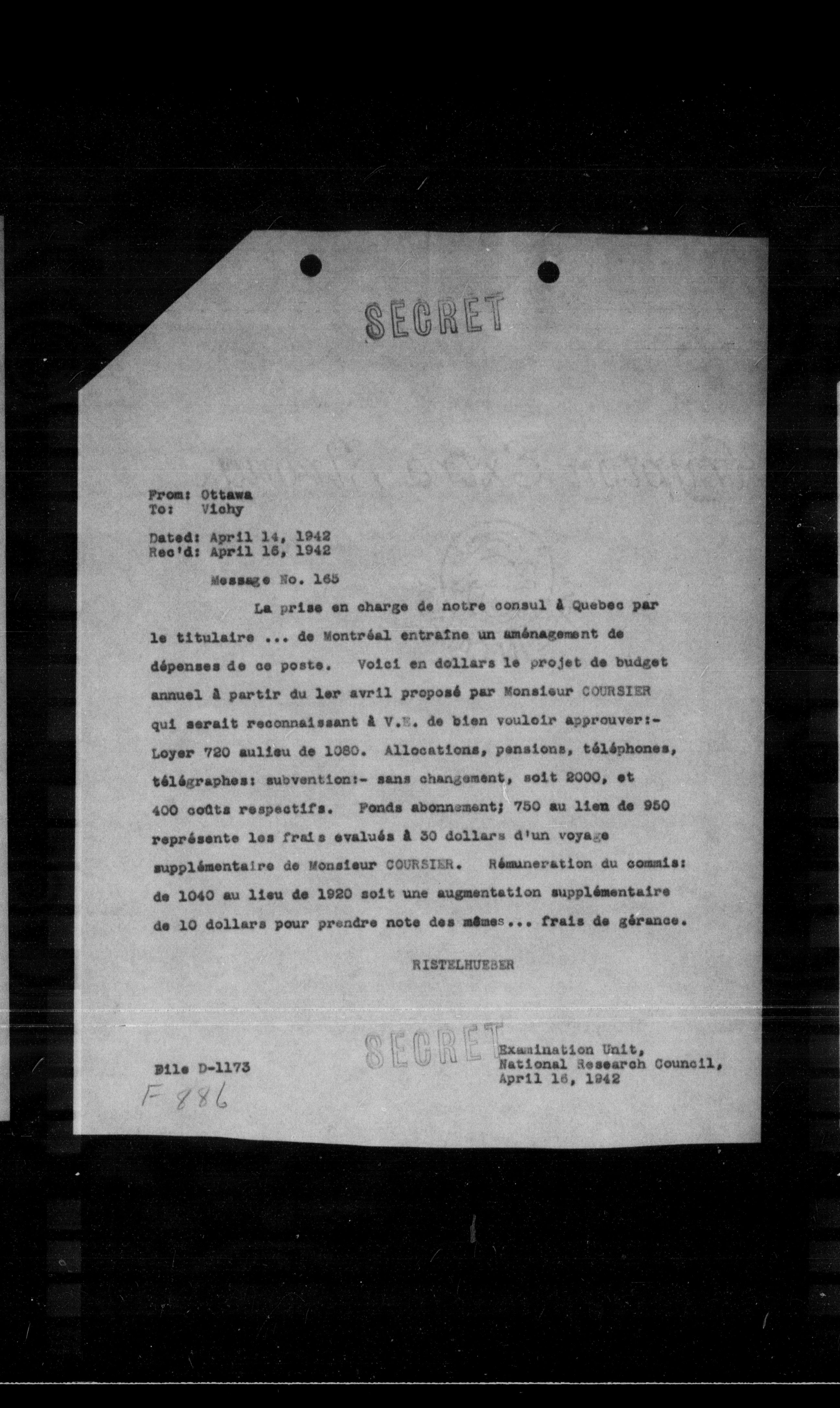 La prise en charge de notre consul a Quebec par le titulaire ... de Montréal entraine un aménagement de dépenses de ce poste. Voici en dollars le projet de budget annuel a partir du ler avril proposé par Monsieur COURSIER qui serait reconnaissant a $V . \mathrm{m}$. de bien vouloir approuver:Loyer 720 aulisu de 1080. Allocations, pensions, téléphones, télégraphes: subvention:- sans changement, soit 2000, et 400 coats respectifs. Fonds abonnement; 750 au lien de 950 représente les frais evalués a 30 dollars d'un voyage supplémentaire de Monsieur COURSIER. Rémuneration du commis: de 1040 au lieu de 1920 soit une augmentation supplémentaire de 10 dollars pour prendre note des meme... frais de gérance.