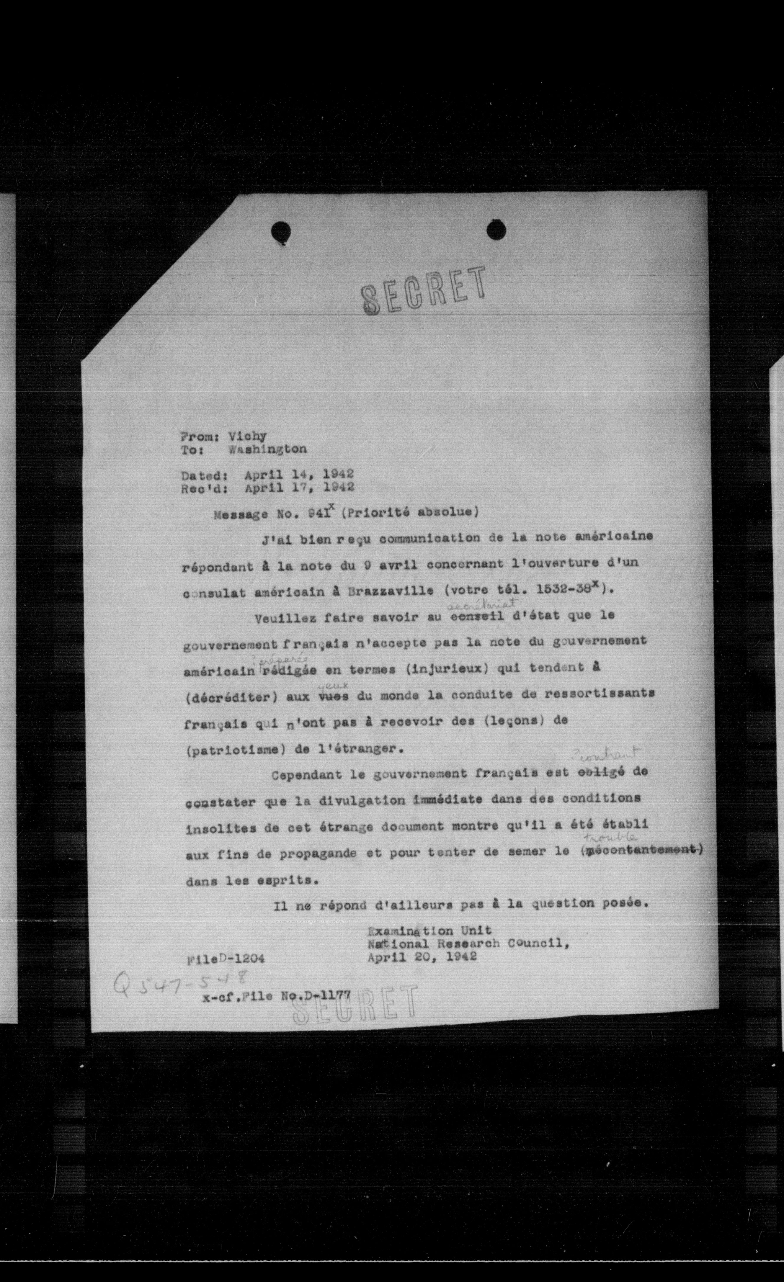 Veuillez faire savoir au conseil d'état que le gouvernement français n'accepte pas la note du gouvernement américain rédigée en termes (injuries) qui tendent à (décréditer) aux vues du monde la conduite de ressortissants français qui n'ont pas à recevoir des (leçons) de (patriotisme) de l'étranger.