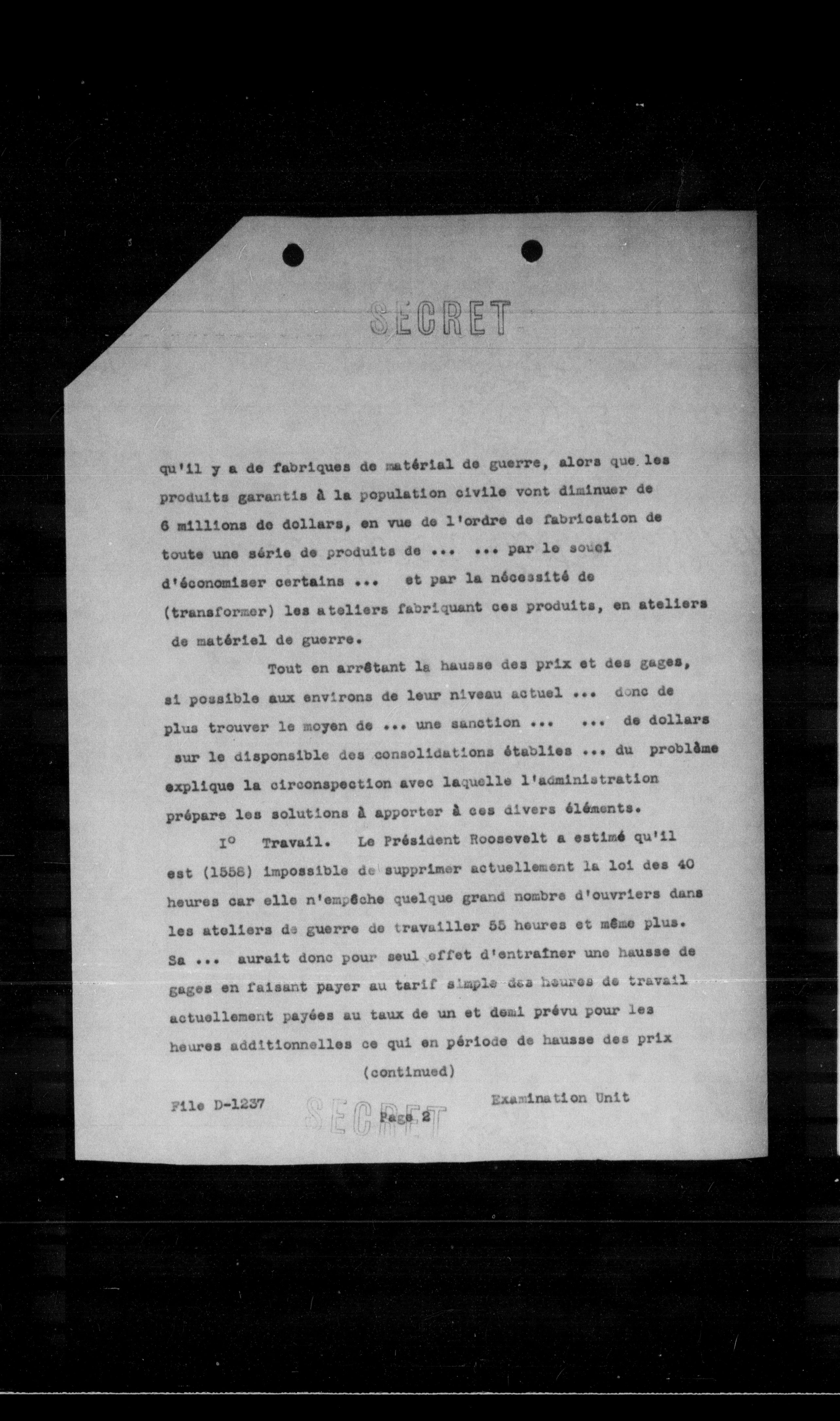 I0 Travail. Le Président Roosevelt a estimé qu'il est (1558) impossible de supprimer actuellement la loi des 40 heures car elle n'empêche quelque grand nombre d'ouvriers dans les ateliers de guerre de travailler 55 heures et même plus. Sa ... aurait donc pour seul effet d'entrainer une hausse de gages en faisant payer au tarif simple des heures de travail actuellement payées au taux de un et dea1 prévu pour les heures additionnelles ce qui en période de hausse des prix (continued)