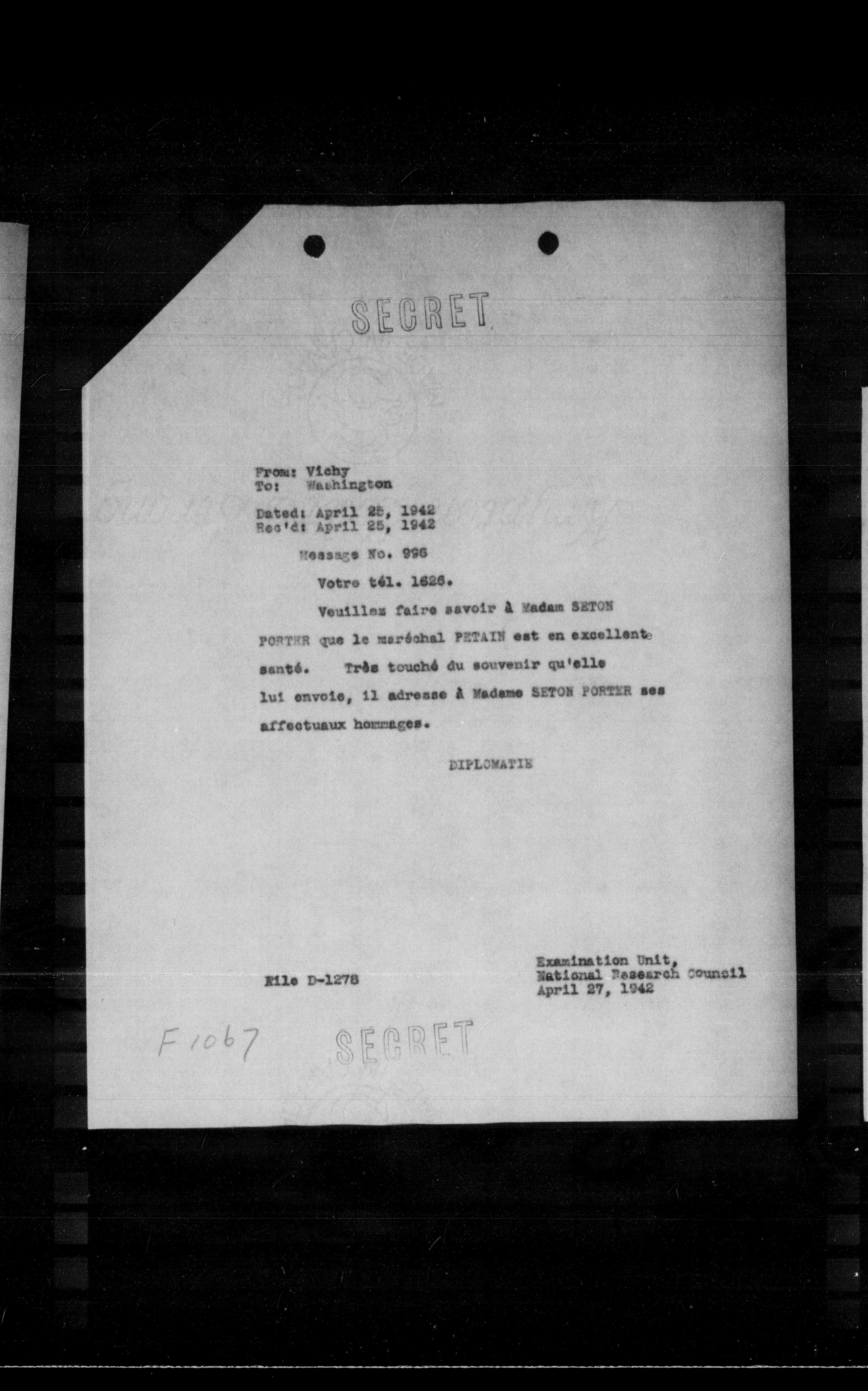 PORTER que le maréchal PETAIN est en excellent