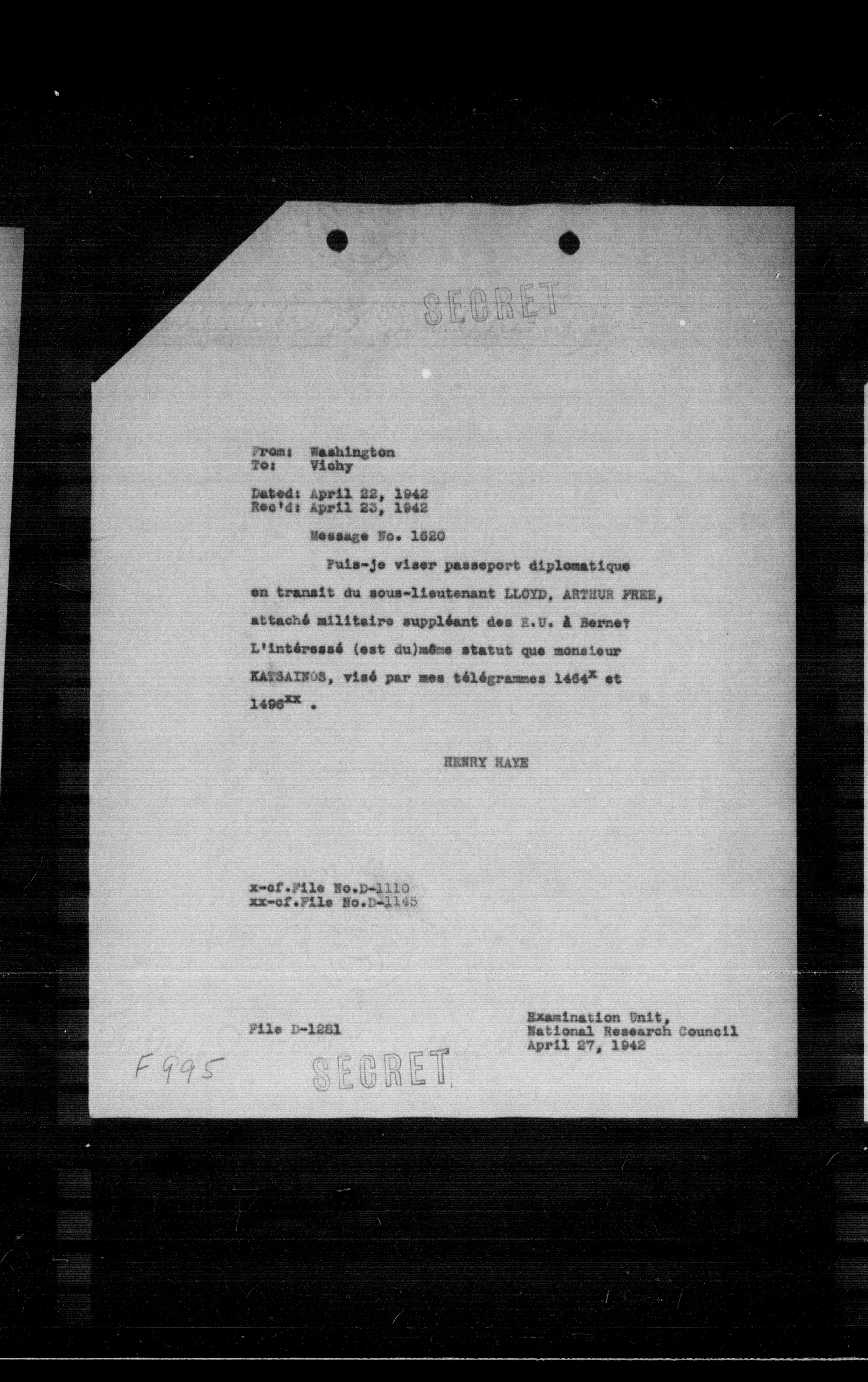 en transit du sous-lieutenant LLOYD, ARTHUR PREE, attaché militaire suppléant des E.U. \& Berne? L'intéressé (est du) même statut que monsieur KASSAINOS, visé par mes télégrammes $1464^{x}$ et $1490^{x x}$.