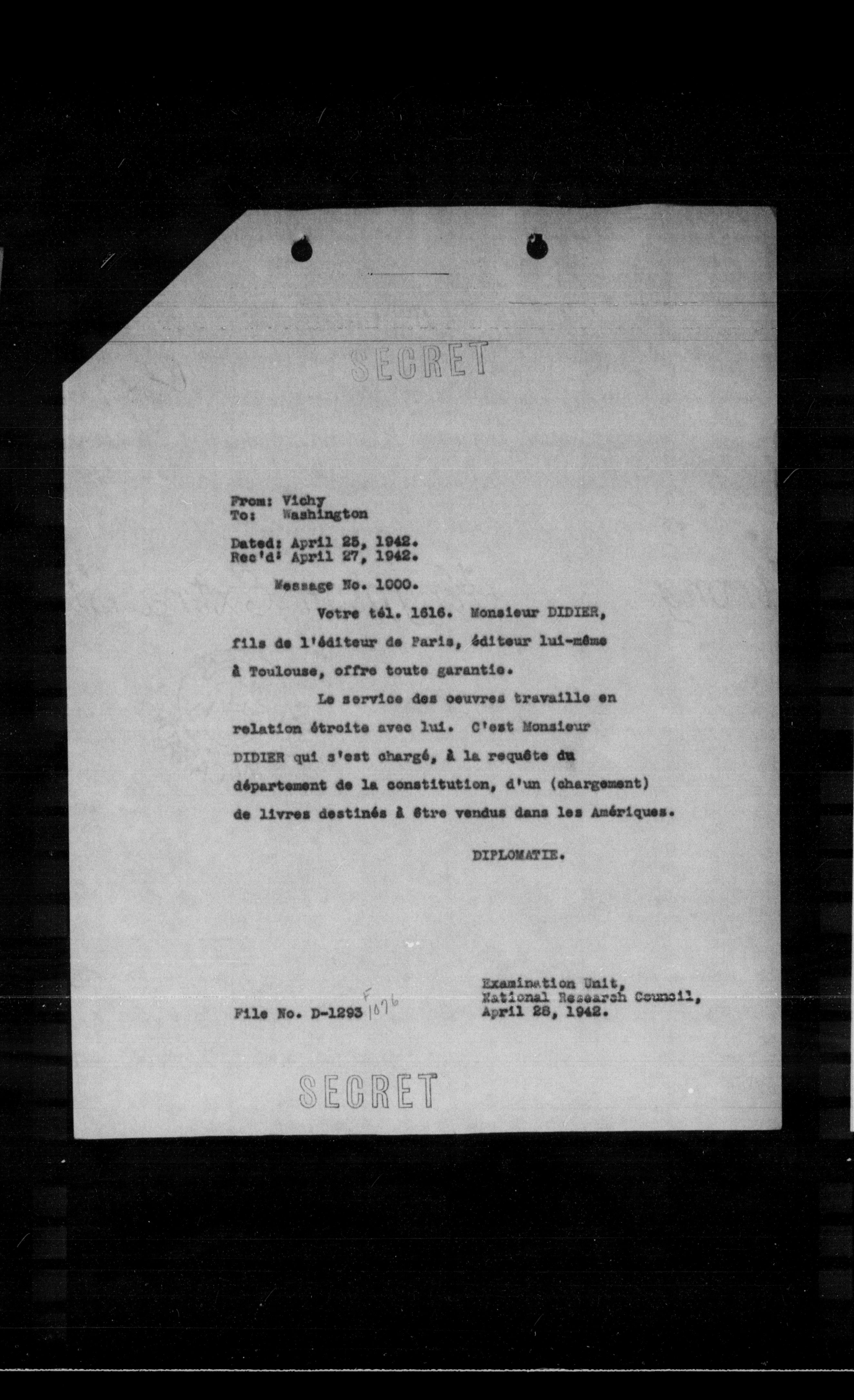 Examinetion Unit, National Researah Coumoll, April 28, 1942.