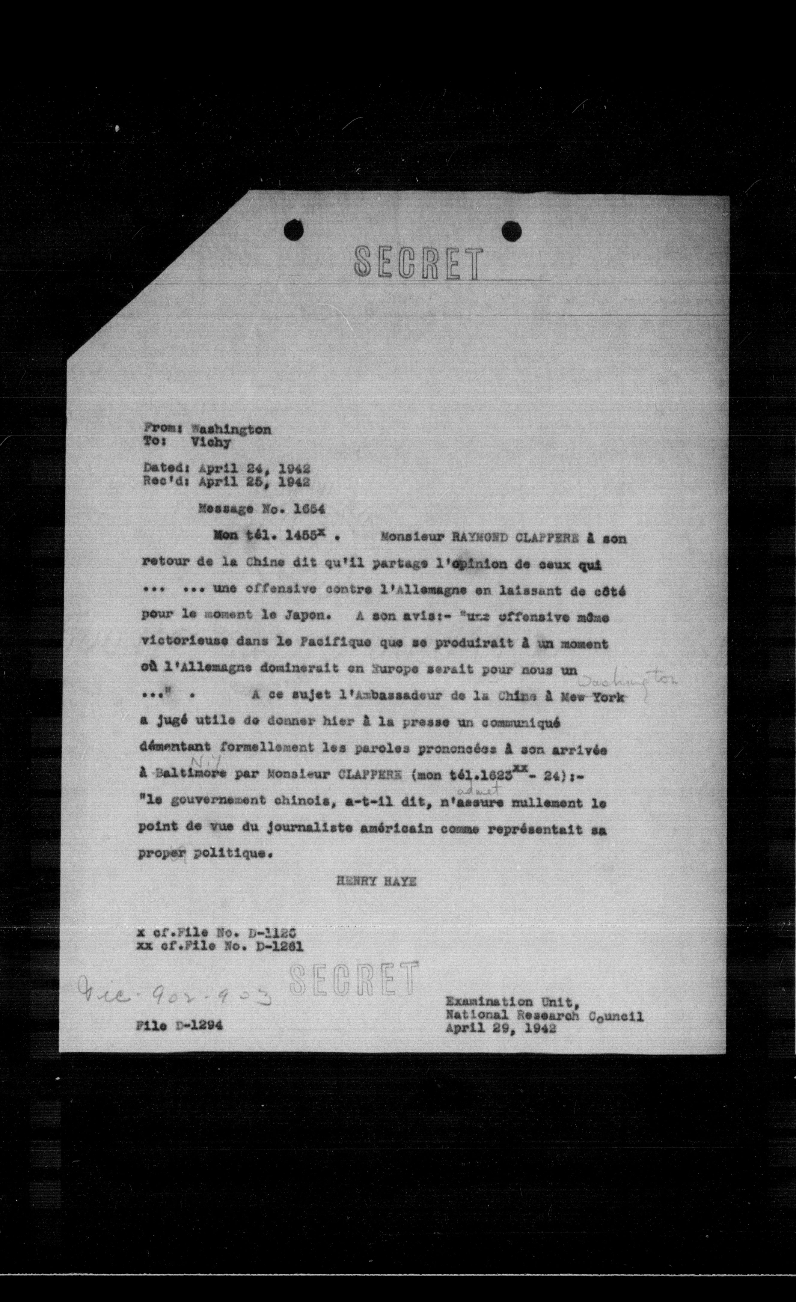 Mon tél. 1455*. Monsieur RAYNORD CLAPPERE & son retour de la Chine dit qu'il partage l'opinion de ceux qui ... une offensive contre l'Allemagne en laissant de côté pour le moment le Japon. A son avis:- "une offensive même victorieuse dans le Pacifique que se produirait à un moment où l'Allemagne dominerait en Europe serait pour nous un ... . . . A ce sujet l'Ambassadeur de la Chine à New York a jugé utile de donner hier à la presse un communiqué démentant formellement les paroles prononcées à son arrivée à Baltimore par Monsieur CLAPPERE (mon tél. 1625** - 24):- "le gouvernement chinois, a-t-il dit, n'assure nullement le point de vue du journaliste américain comme représentait sa propre politique.