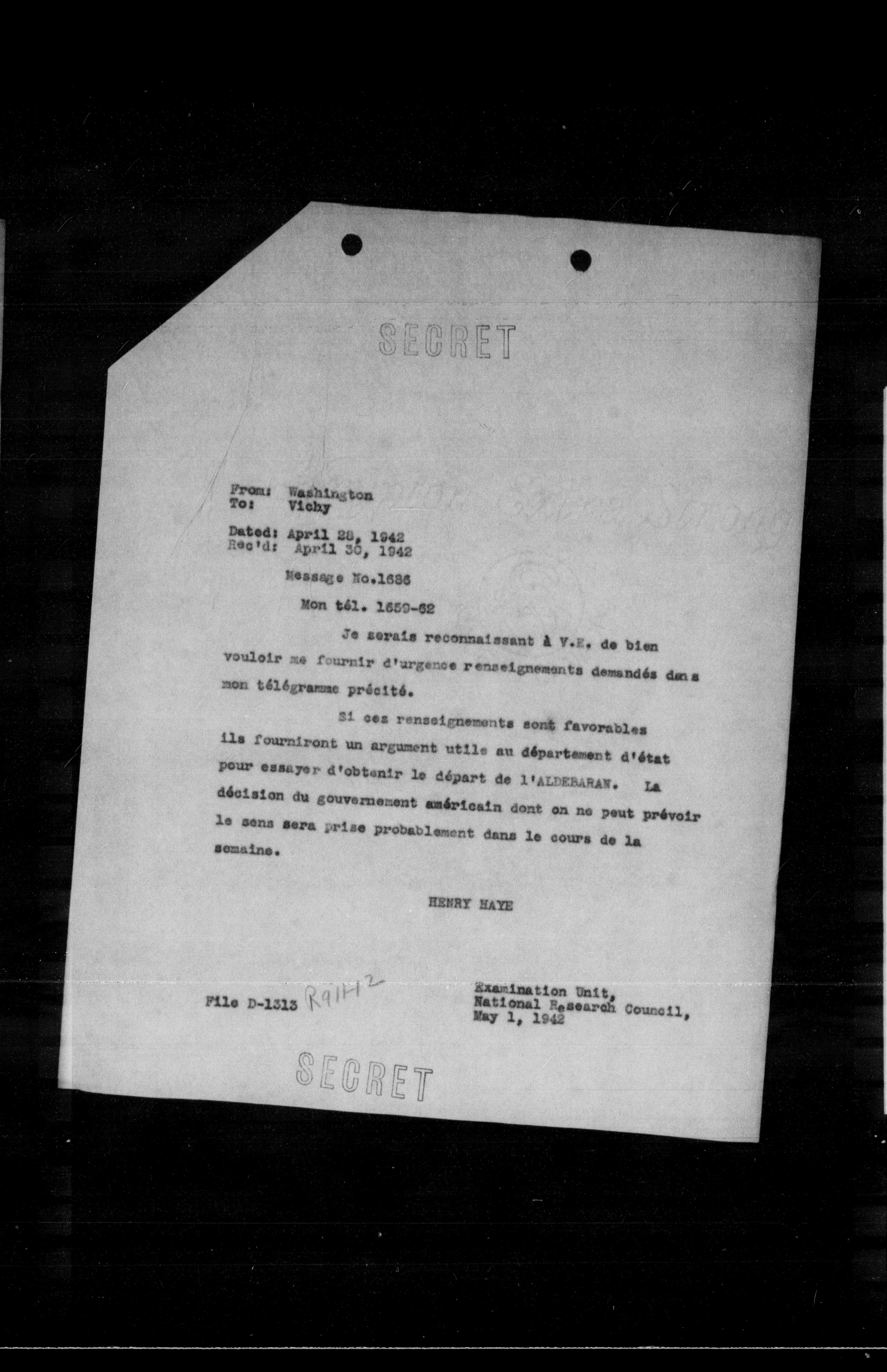 Si ces renseignements sont favorables ils fourniront un argument utile au département d'état pour essayer d'obtenir le départ de l'ALDEBARAN. La décision du gouvernement américain dont on ne peut prévoir le sens sera prise probablement dans le cours de la semaine.