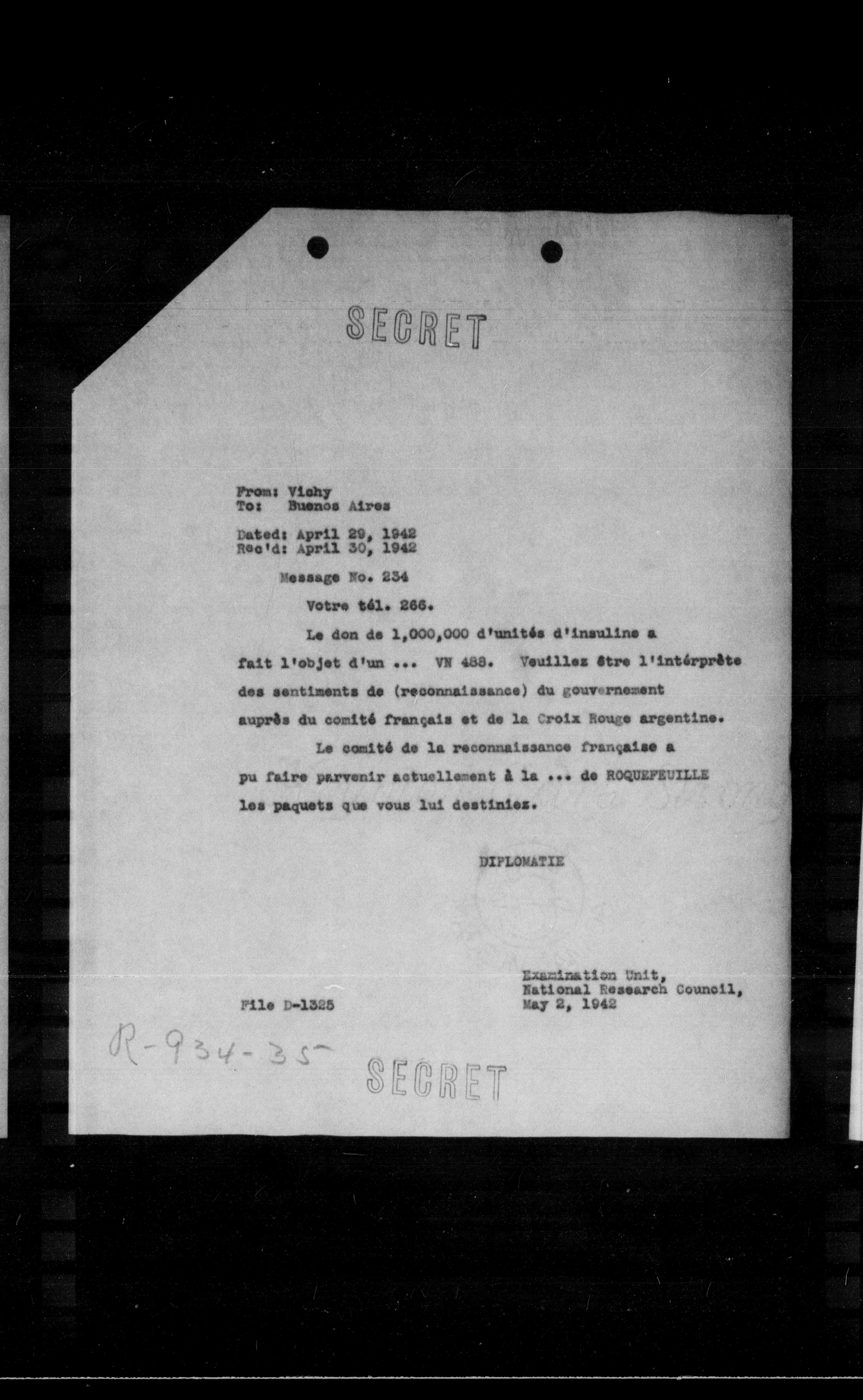 des sentiments de (reconnaissance) du gouvernement auprès du comité français et de la Croix Rouge argentine.