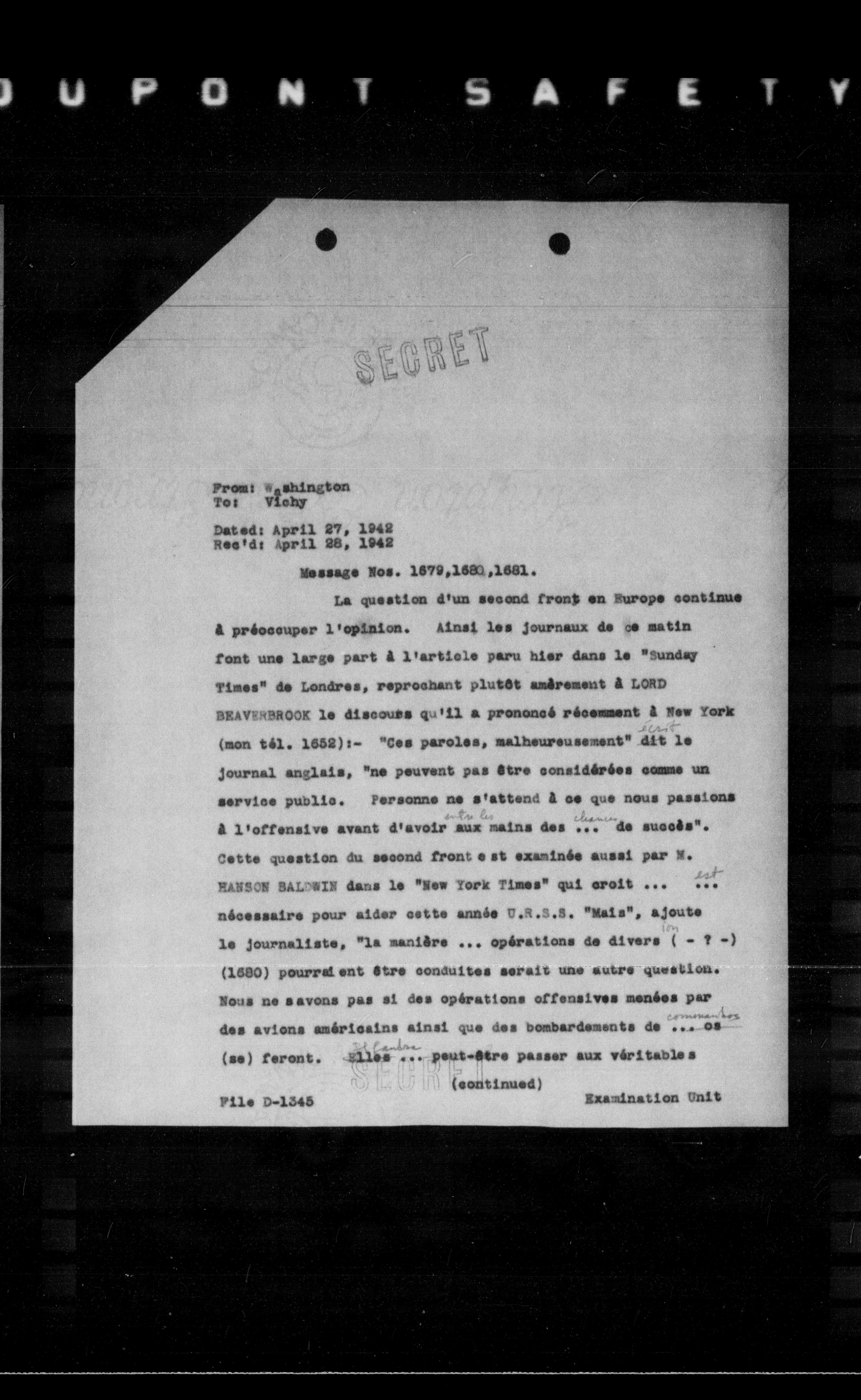 BHAVERBROOK le discours qu'il a prononcé récemment a New York (mon tel. 1882):- "Ces paroles, malheureusement" dit le journal anglais, "ne peuvent pas être considérées comme un service public. Personne ne s'attend à ce que nous passions à l'offensive avant d'avoir aux mains des ... de succee". Cette question du second front est examinée aussi par M. HANSON BALDWIN dans le "New York Times" qui croit ... ... nécessaire pour aider cette année U.R.S.S. "Mais", ajoute le journaliste, "la manière ... opérations de divers ( - ? -) (1880) pourral ent etre conduites serait une autre question. Nous ne savons pas si des opérations offensives menées par des avions américains ainsi que des bombardements de ... ce (se) feront. Elles ... peut-etre passer aux véritables