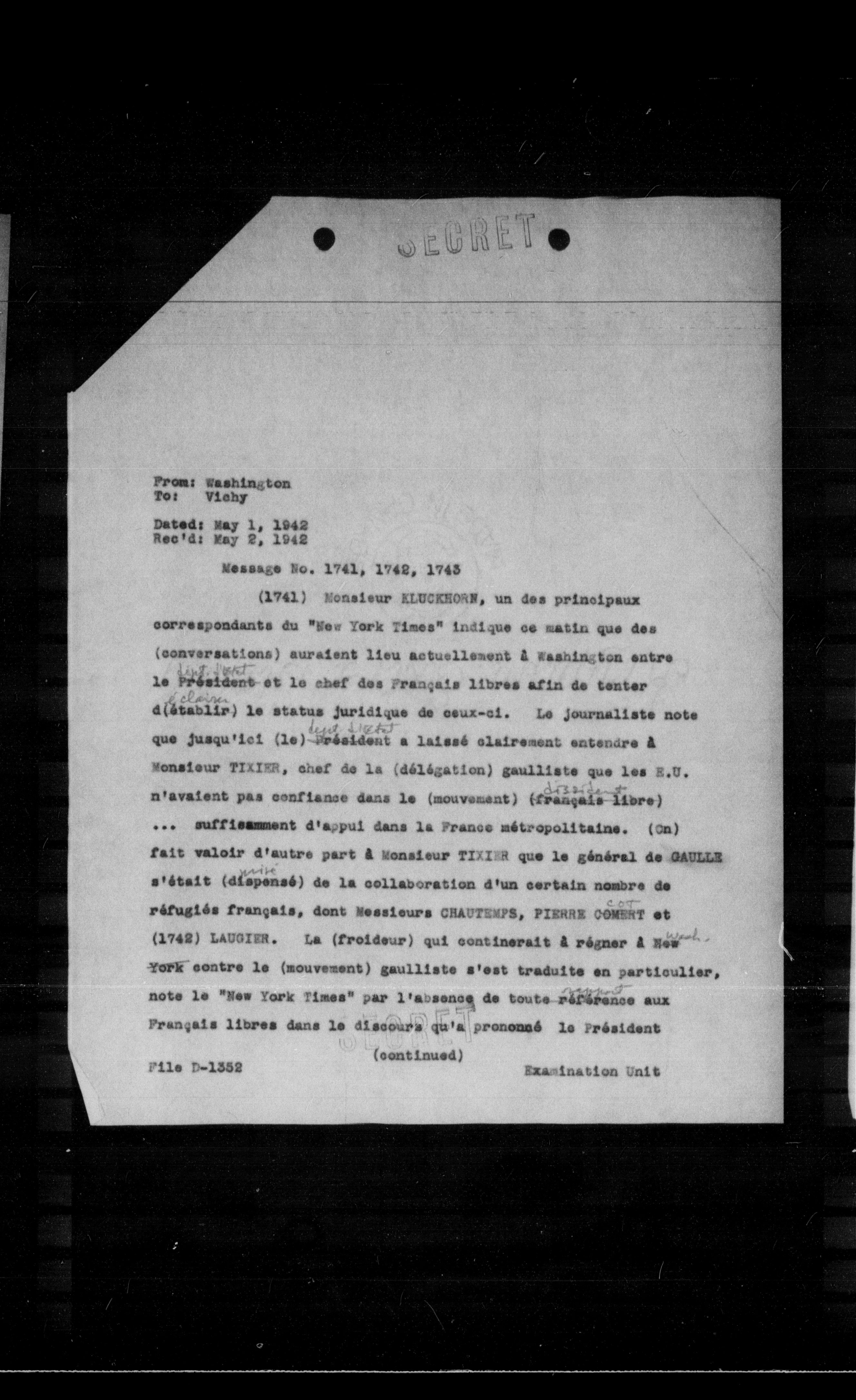 (1741) Monsieur KLUCKHORN, un des principaux correspondants du "New York Times" indique ce matin que des (conversations) auraient lieu actuellement à Washington entre le Président et le chef des Français libres afin de tenter d'établir le statut juridique de ceux-ci. Le journaliste note que jusqu'ici (le) Président a laissé clairement entendre à Monsieur TIXIER, chef de la (délégation) gaulliste que les S.U. n'avaient pas confiance dans le (mouvement) (français libre) suffisamment d'appui dans la France métropolitaine. (On) fait valoir d'autre part à Monsieur TIXIER que le général de GAULLS s'était (dispensé) de la collaboration d'un certain nombre de réfugiés français, dont Messieurs CHAUTEMPS, PIERRE COMPET et (1742) LAUGIER. Le (froideur) qui continerait à régner à New York contre le (mouvement) gaulliste s'est traduite en particulier, note le "New York Times" par l'absence de toute référence aux Français libres dans le discours qu'a prononcé le Président (continued)