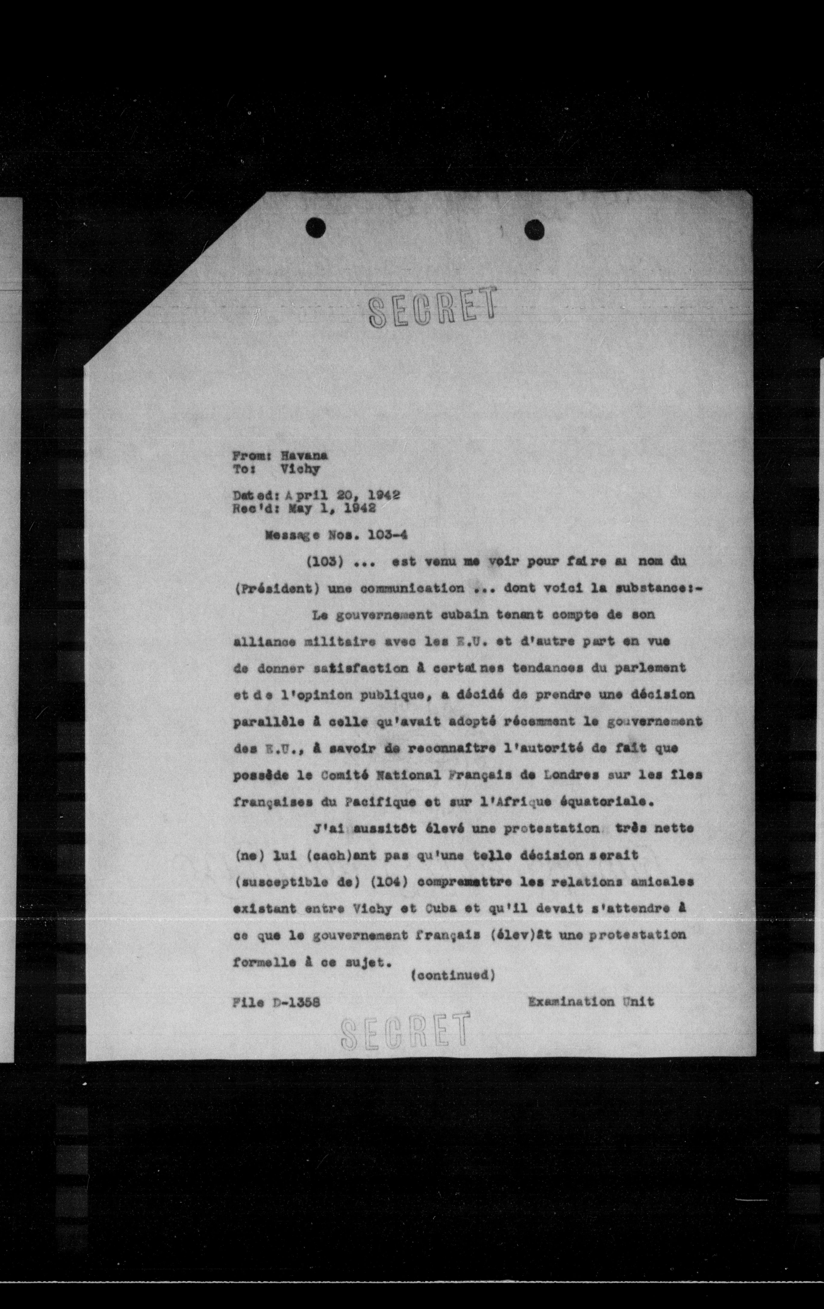Le gouvernement cubain tenant compte de son alliance militaire avec les E.U. et d'autre part en vue de donner satisfaction à certal nes tendances du parlement et de l'opinion publique, a décidé de prendre une décision parallèle à celle qu'avait adopté récemment le gouvernement des E.U., à savoir de reconnaitre l'autorité de fait que possede le Comite National Français de Londres sur les tles françaises du Pacifique et sur l'Afrique équatoriale.