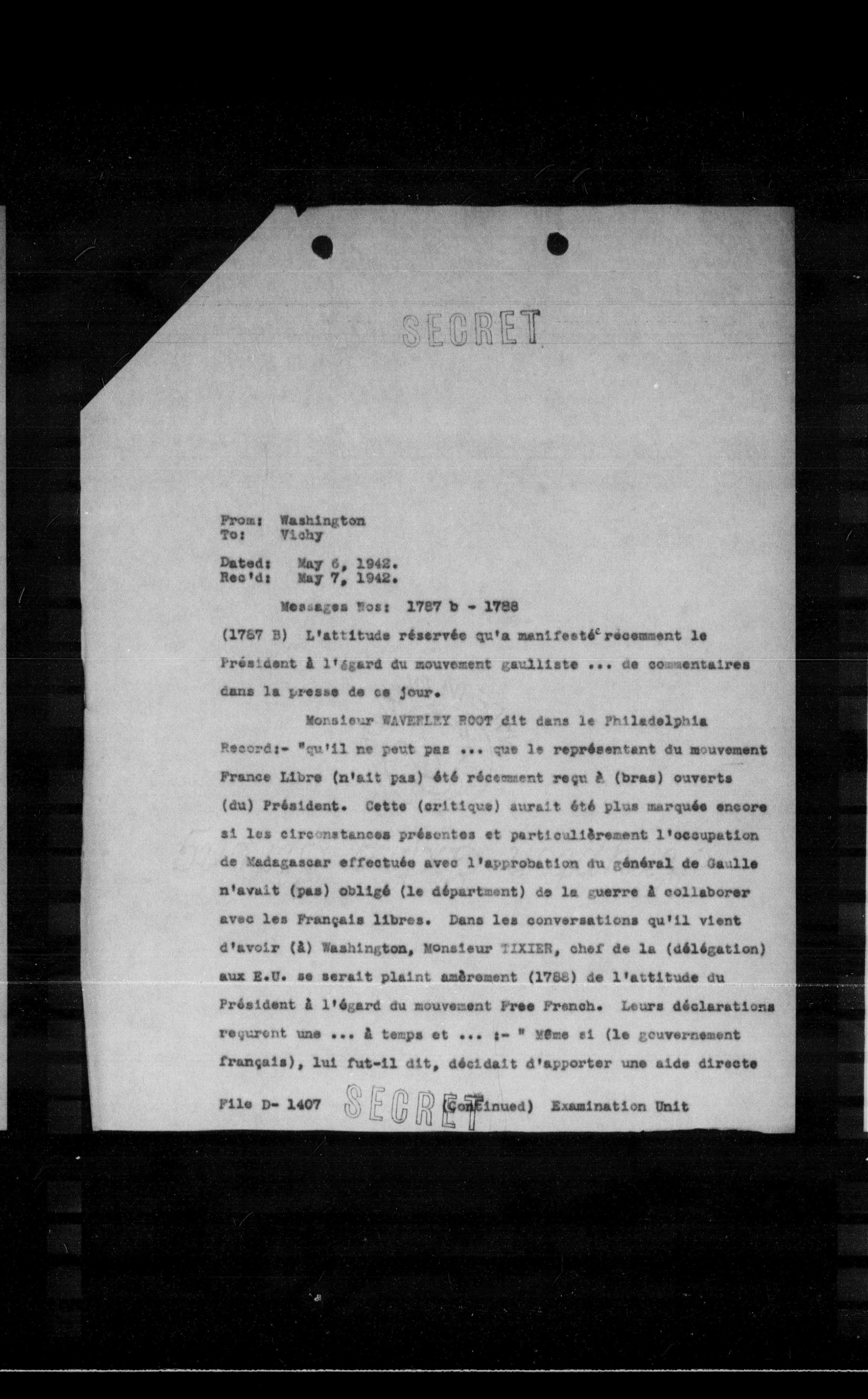 Monsieur WAVEFLEY ROOT dit dans le Philadelphia Record:- "qu'il ne peut pas ... que le représentant du mouvement France Libre (n'ait pas) été récemment reçu à (bras) ouverts (du) Président. Cette (critique) aurait été plus marquée encore si les circonstances présentes et particulièrement l'occupation de Madagascar effectuée avec l'approbation du général de Gaulle n'avait (pas) obligé (le département) de la guerre à collaborer avec les Français libres. Dans les conversations qu'il vient d'avoir (à) Washington, Monsieur TIXIER, chef de la (délégation) aux E.U. se serait plaint amèrement (1788) de l'attitude du Président à l'égard du mouvement Free French. Leurs déclarations requiert une ... à temps et ... :- " Même si (le gouvernement français), lui fut-il dit, décidait d'apporter une aide directe