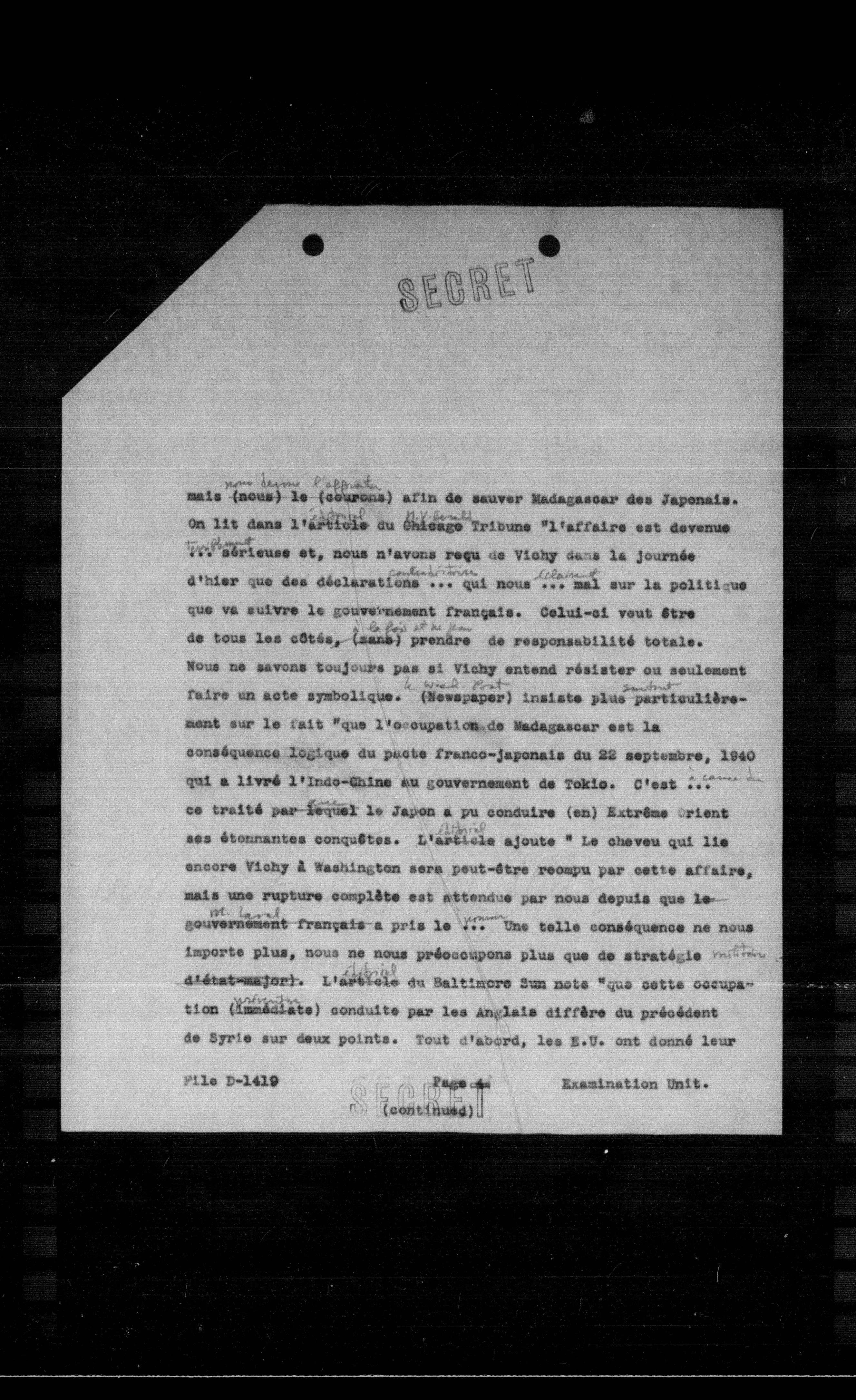 mais (nous) le (courons) afin de sauver Madagascar des Japonais. On lit dans l'artiole du Ohicage Tribune "l'affaire est devenue 11. Sêrieuse et, nous n'avons reçu de Vichy dans la journée d'hier que des déclarations ... qui nous ... mal sur la politique que va suivre le gouvernement français. Celui-ci veut être de tous les côtés, (sans) prendre de responsabilité totale. Nous ne savons toujours pas si Vichy entend résister ou seulement faire un acte symbolique. (Beaapaper) insiste plus particulièrement sur le fait "que l'oecupation de Madagascar est la conséquence logique du pacte franco-japonais du 22 septembre, 1940 qui a livré l'Indo-Chine au gouvernement de Tokio. C'est ce traité par lequel le Japon a pu conduire (en) Extrême Orient ses étonnantes conquêtes. L'article ajoute " Le cheveu qui lie encore Vichy à Washington sera peut-être reompu par cette affaire, mais une rupture complète est attendue par nous depuis que le gouvernement français a pris le ... Une telle conséquence ne nous importe plus, nous ne nous préoccupons plus que de stratégie d'état-major). L'article du Baltimore Sun note "que cette occupation (immediate) conduite par les Anglais diffère du précédent de Syrie sur deux points. Tout d'abord, les E.U. ont donné leur