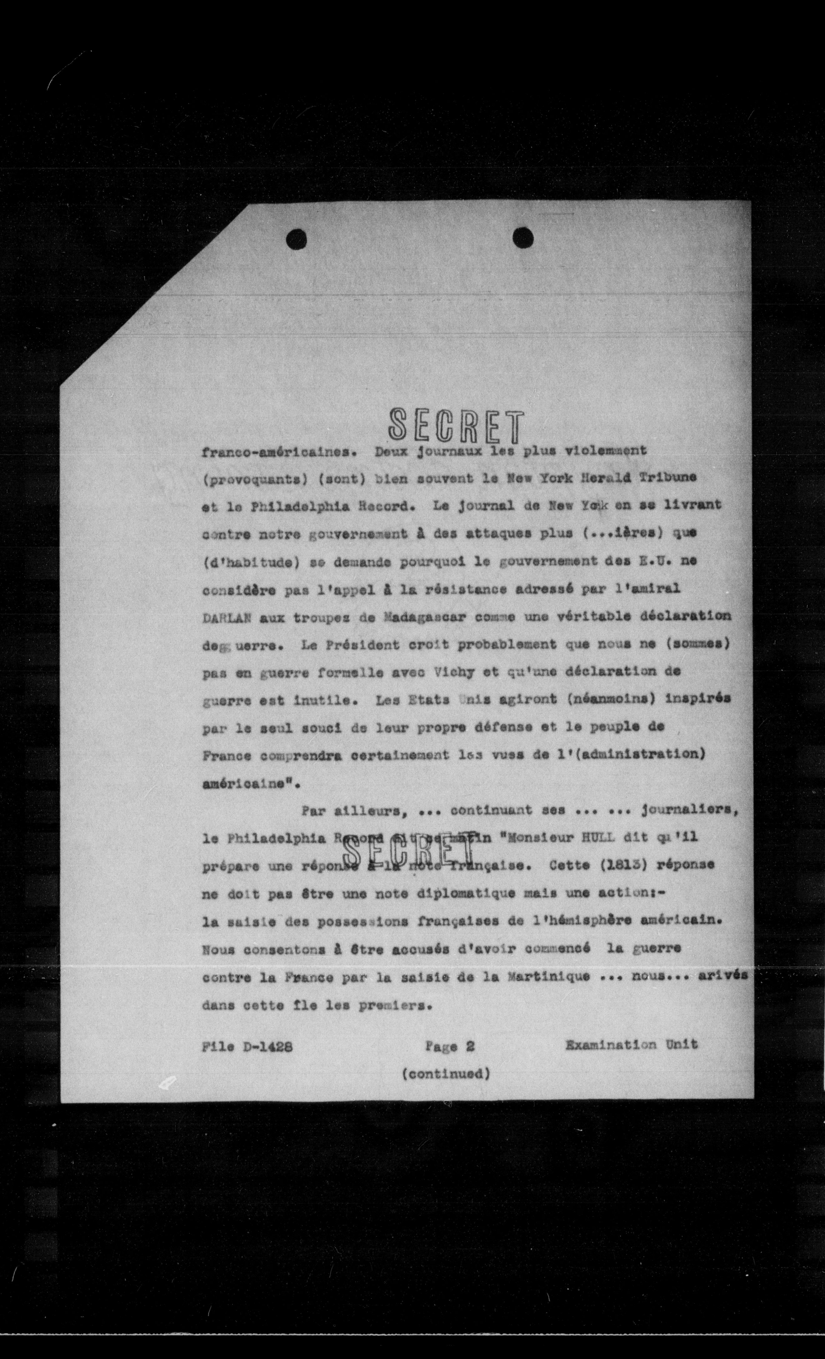 franco-américaines. Deux journaux les plus violemment (provoquants) (sont) bien souvent le New York Herald Tribune et le Philadelphia Record. Le journal de New Yew on se livrant contre notre gouvernement à des attaques plus (...1ères) que (d'habitude) se demande pourquoi le gouvernement des E.U. ne considère pas l'appel à la résistance adressé par l'amiral DARLAN aux troupes de Madagascar comme une véritable déclaration de querre. Le Président croit probablement que nous ne (sommes) pas en guerre formelle avec Vichy et qu'une déclaration de guerre est inutile. Les Etats Unis agiront (néanmoins) inspirés par le seul souci de leur propre défense et le peuple de France comprendra certainement les vuss de l'(administration) américaine".