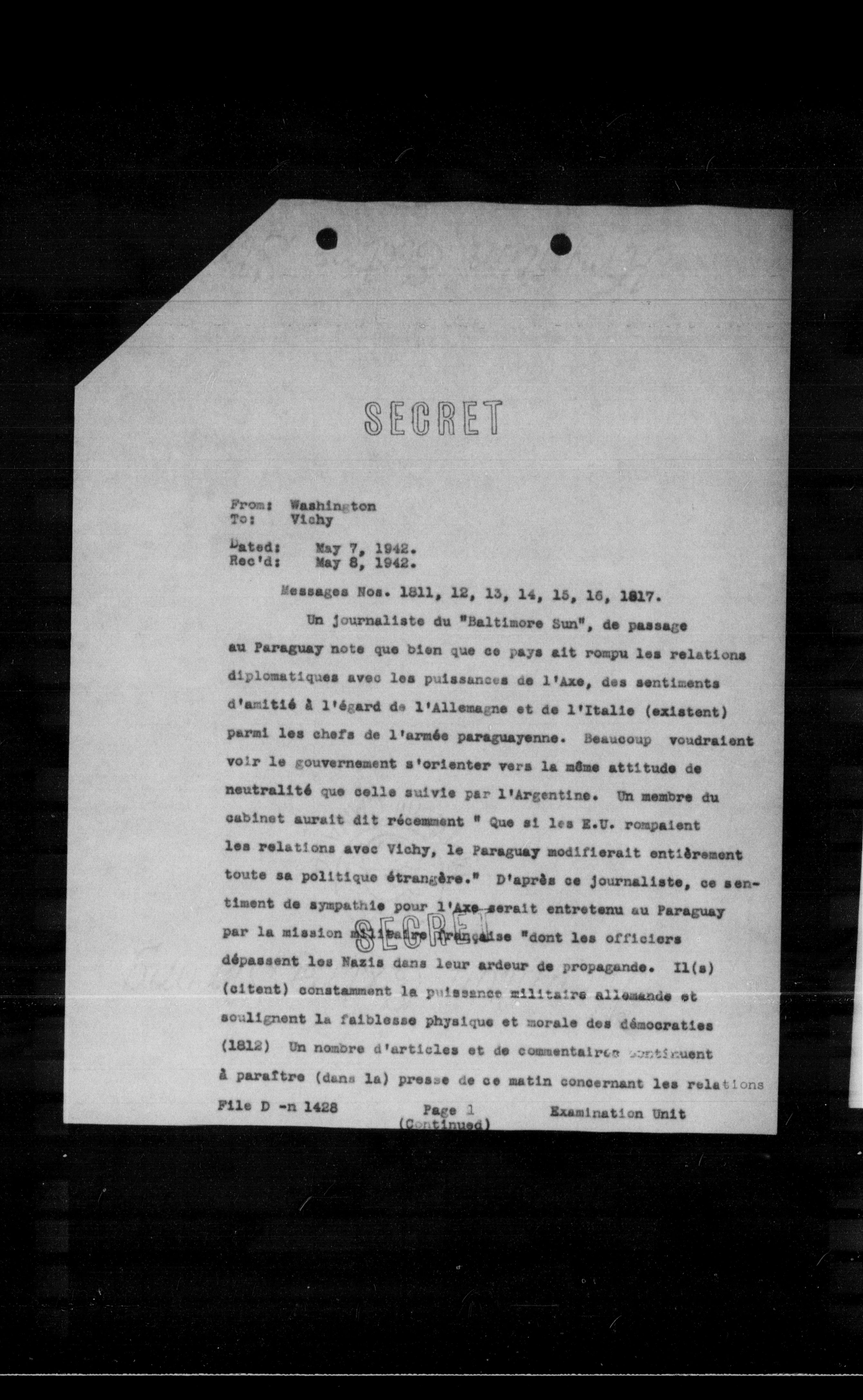 au Paraguay note que bien que ce pays ait rompu les relations diplomatiques avec les puissances de l'axe, des sentiments d'amitié à l'égard de l'Allemagne et de l'Italie (existent) parmi les chefs de l'armée paraguayenne. Beaucoup voudraient voir le gouvernement s'orienter vers la même attitude de neutralité que celle suivie par l'Argentine. Un membre du cabinet aurait dit récemment " que si les E.U. rompaient les relations avec Vichy, le Paraguay modifierait entièrement toute sa politique étrangère." D'après ce journaliste, ce sentiment de sympathie pour l'axe serait entretenu au Paraguay par la mission militaire française "dont les officiers dépassent les Naxis dans leur ardeur de propagande. Il(s) (citent) constamment la puissance militaire allemande et soulignent la faiblesse physique et morale des démocraties (1812) Un nombre d'articles et de commentaires continuent à paraître (dans la) presse de ce matin concernant les relations File D -n 1428