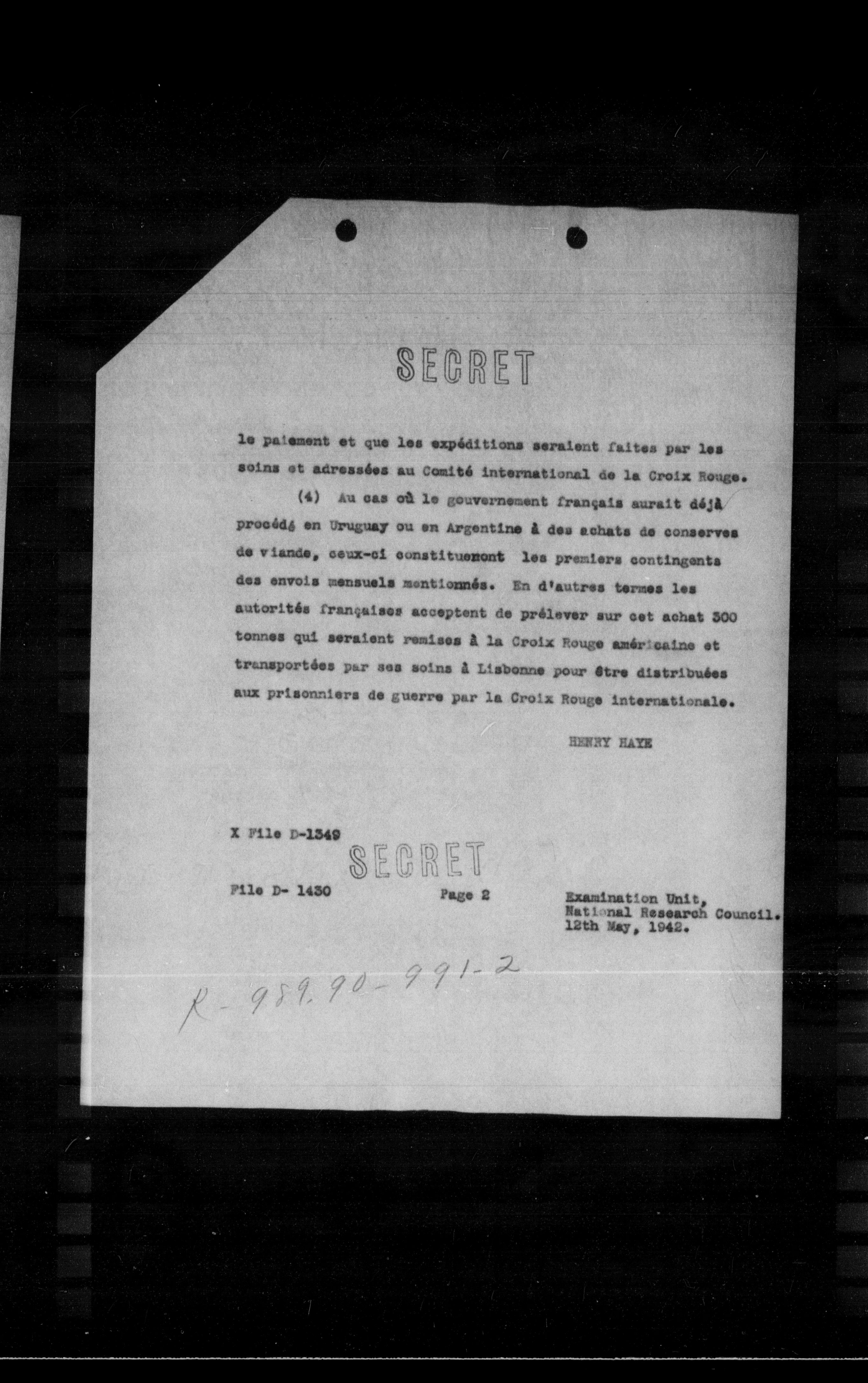 (4) Au cas où le gouvernement français aurait déjà procédé en Uruguay ou en Argentine à des achats de conserves de viande, ceux-ci constituenont les premiers contingents des envois mensuels mentionnés. En d'autres termes les autorités françaises acceptent de prélever sur cet achat 300 tonnes qui seraient remises à la Croix Rouge américaine et transportées par ses soins à Lisbonne pour être distribuées aux prisonniers de guerre par la Croix Rouge internationale.