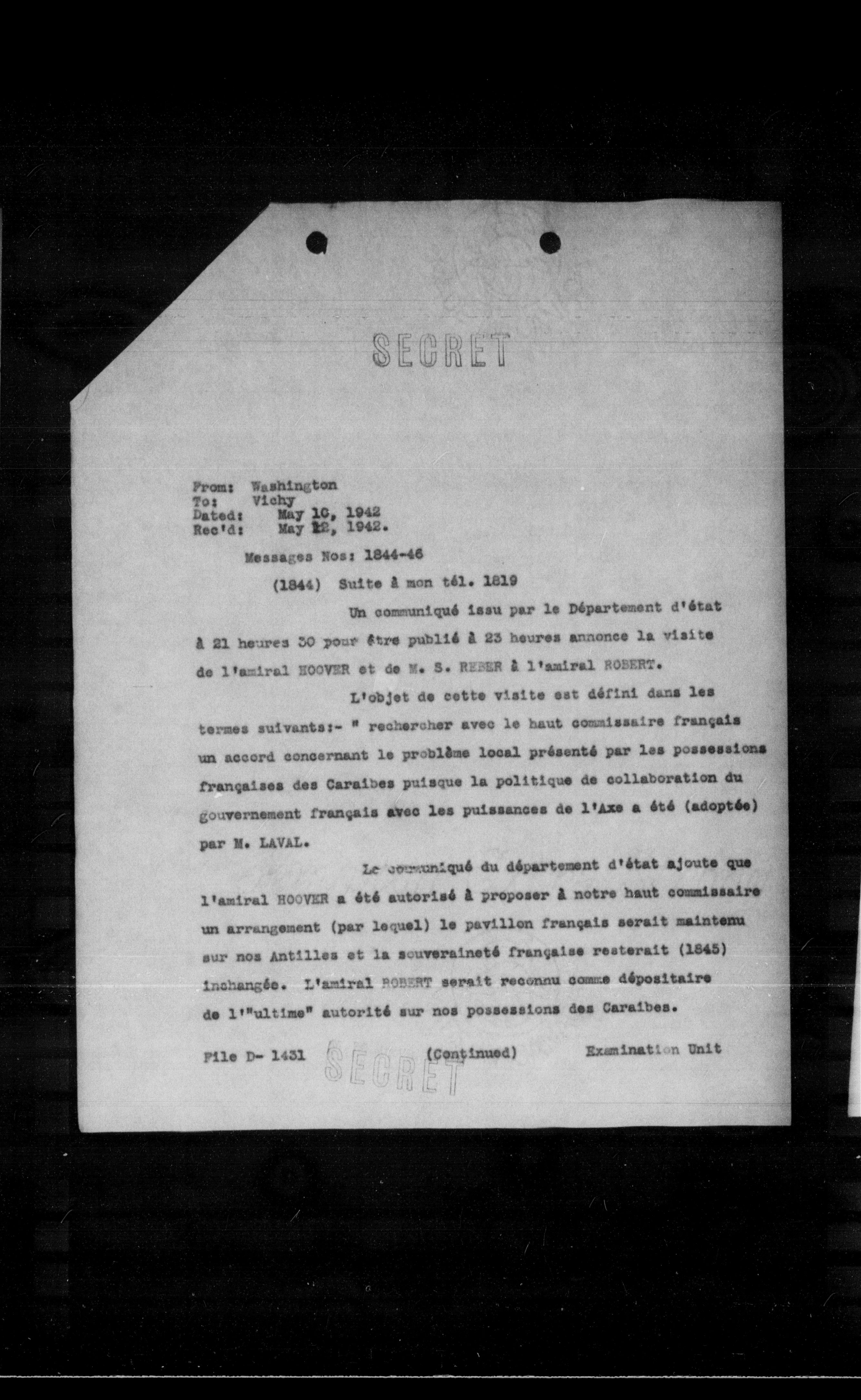 Le communiqué du département d'état ajoute que l'amiral HOOVER a été autorisé à proposer à notre haut commissaire un arrangement (par lequel) le pavillon frangais serait maintenu sur nos Antilles et la souveraineté française resterait (1845) inchangée. L'amiral ROBERT serait reconnu comme dépositaire de l'"ultime" autorité sur nos possessions des Caraibes.