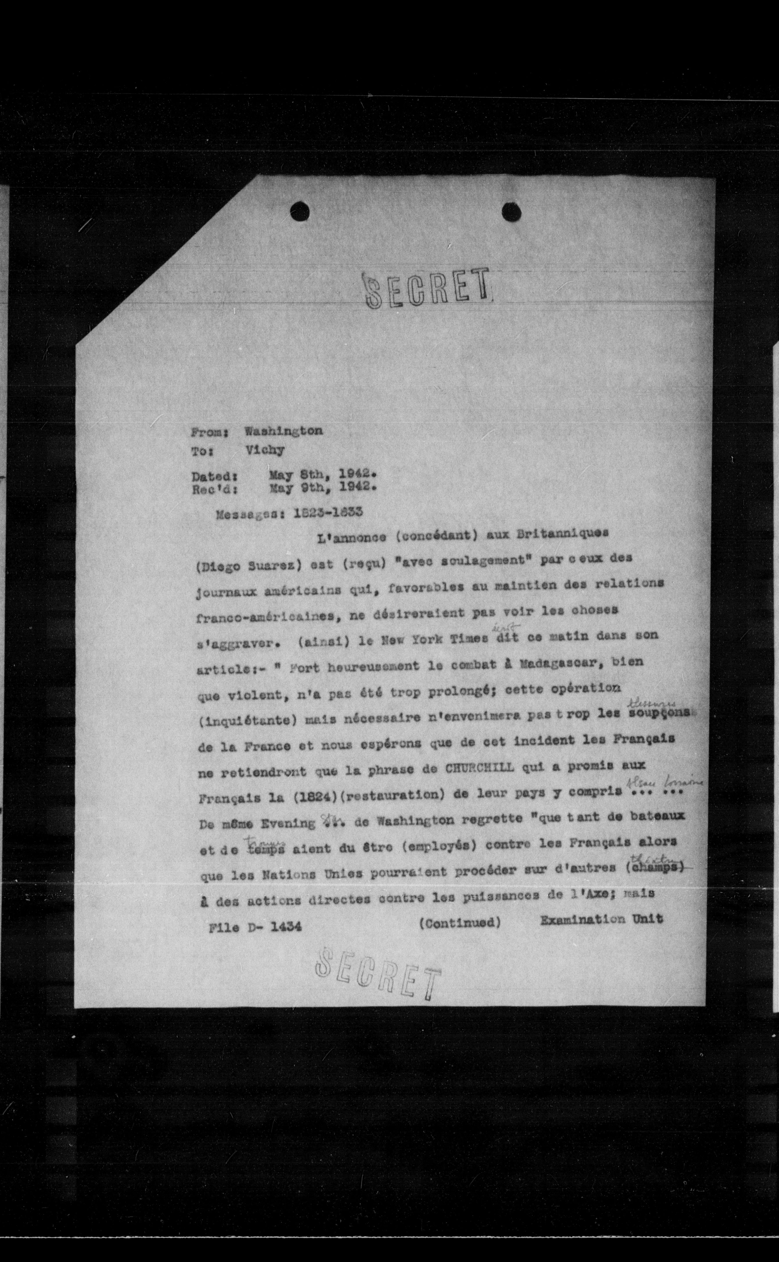 (Diego Suarez) est (reçu) "avec soulagement" par ceux des journaux américains qui, favorables au maintien des relations franco-américaines, ne désireraient pas voir les choses s'aggraver. (ainsi) le New York Times dit ce matin dans son article: "Fort heureusement le combat à Madagascar, bien que violent, n'a pas été trop prolongé; cette opération (inquiétante) mais nécessaire n'envenimera pas trop les soupçons de la France et nous espérons que de cet incident les Français ne retiendront que la phrase de CHURCHILL qui a promis aux Français la (1824) (restauration) de leur pays y compris."