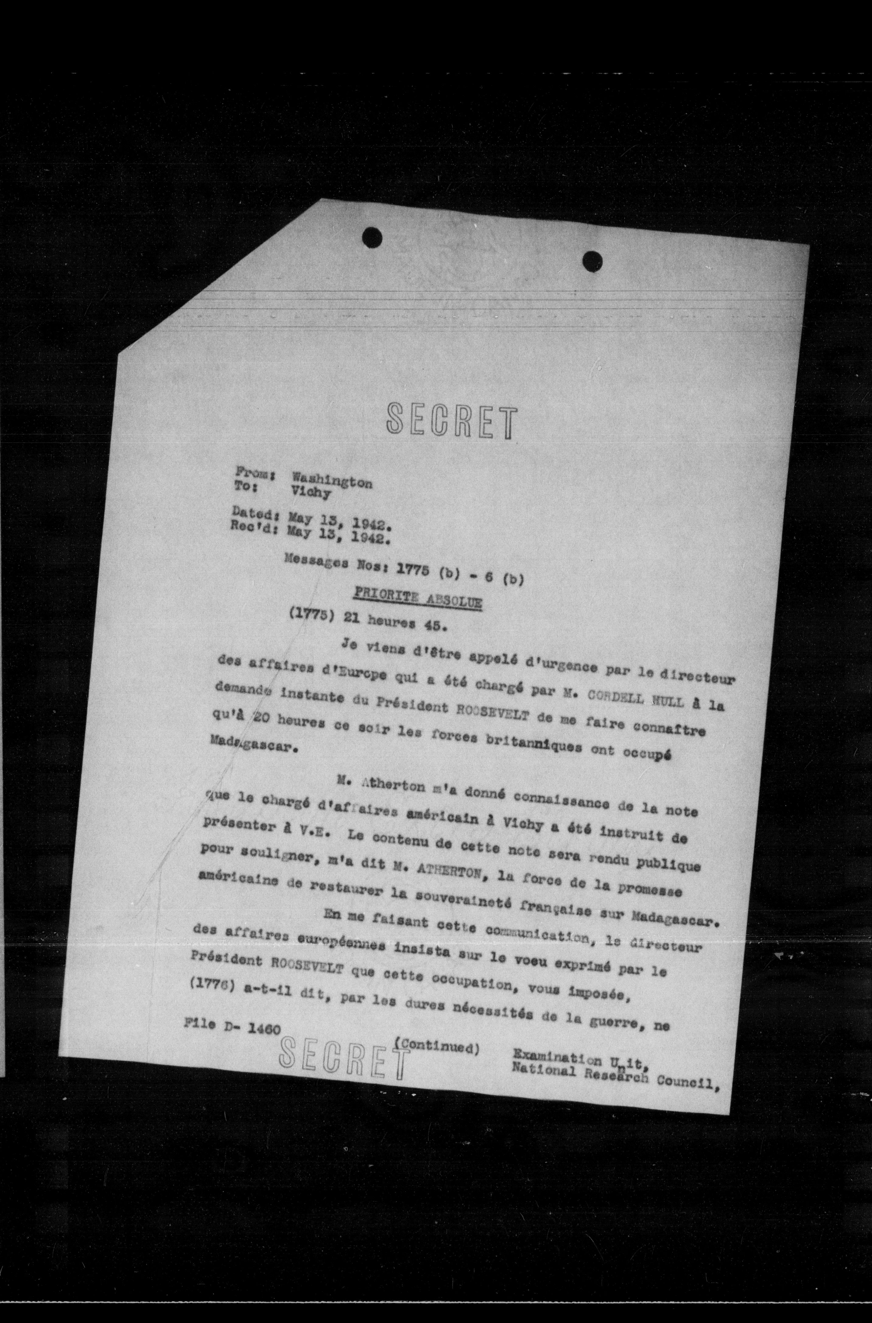 Je viens d'être appelé d'urgence par le directeur des affaires d'Europe qui a été chargé par M. CORDELL HULL à la demande instante du Président ROOSEVELT de me faire connaitre qu'ả 20 heures ce soir les forces britanniques ont occupé Madagascar.