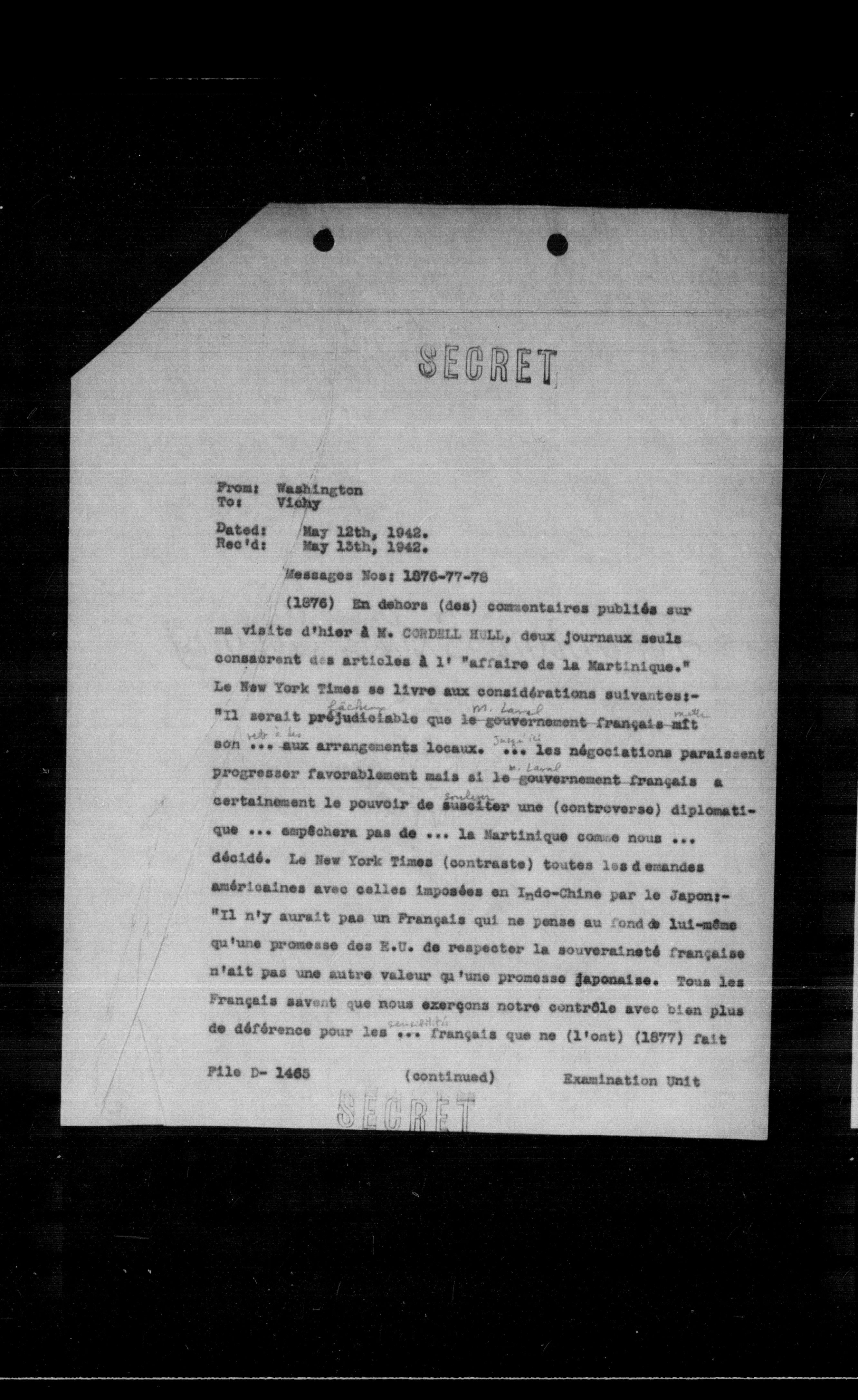(1876) En dehors (des) commentaires publiés sur ma visite d'hier a M. CORDELL HILL, deux journaux seuls consacrent des articles a 1' "affaire de la Martinique." Le New York Times se livre aux considérations suivantes:"Il serait préjudiciable que le gouvernement français mit son ... aux arrangements locaux. ... les négociations paraissent progresser favorablement mais si le gouvernement français a certainement le pouvoir de susciter une (controverse) diplomatique ... empêchera pas de ... la Martinique come nous ... décidé. Le New York Times (contraste) toutes les demandes américalnes avec celles imposées en Iydo-Chine par le Japon:"Il n'y aurait pas un Français qui ne pense au fond de lui-meme qu'une promesse des E.U. de respecter la souveraineté française n'ait pas une autre valeur qu'une promesse japonaise. Tous les Français savent que nous exerçons notre contrôle avec bien plus de déférence pour les ... français que ne (l'ont) (1877) fait