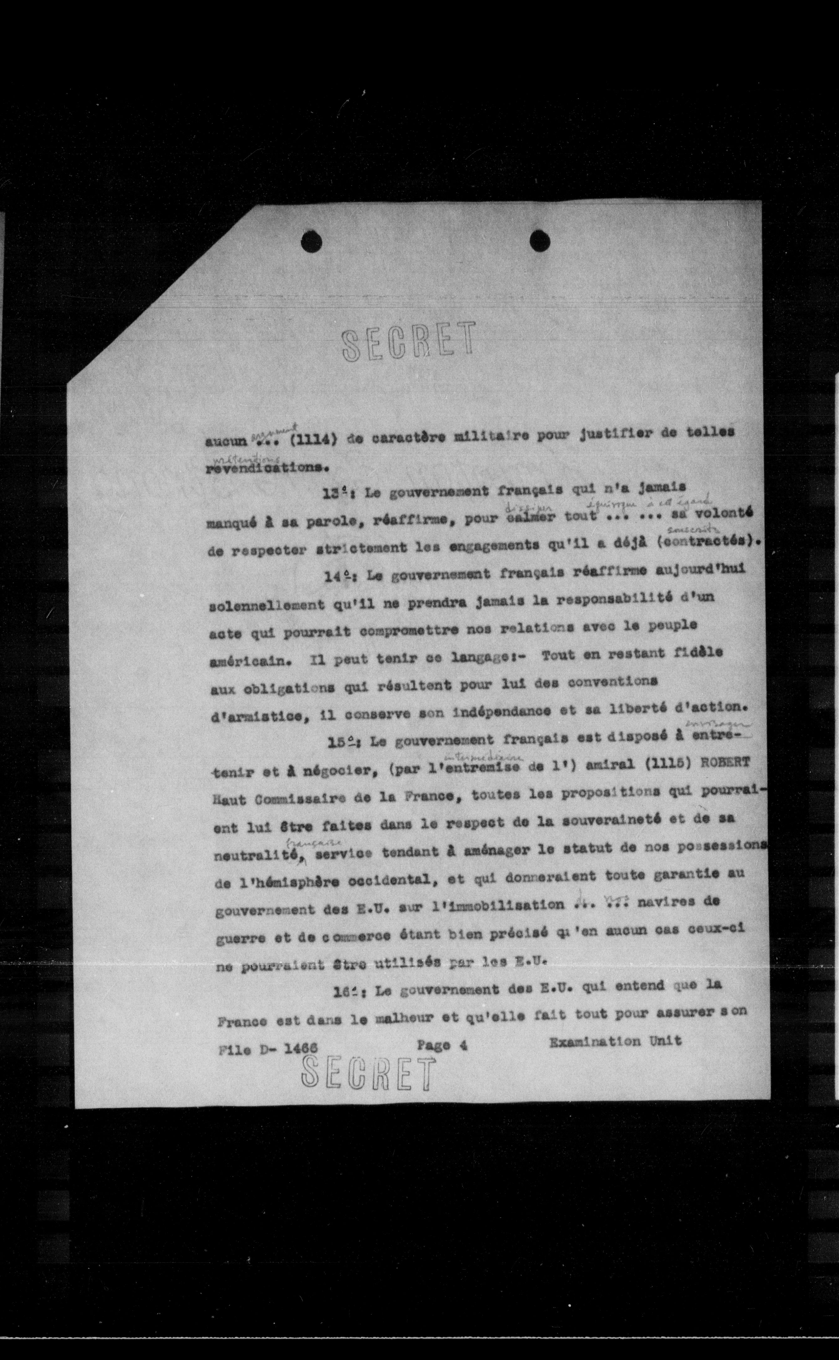 16: Le gouvernement des E.U. qui entend que la France est dans le malheur et qu'elle fait tout pour assurer son File D- 1466 Page 4 Examination Unit