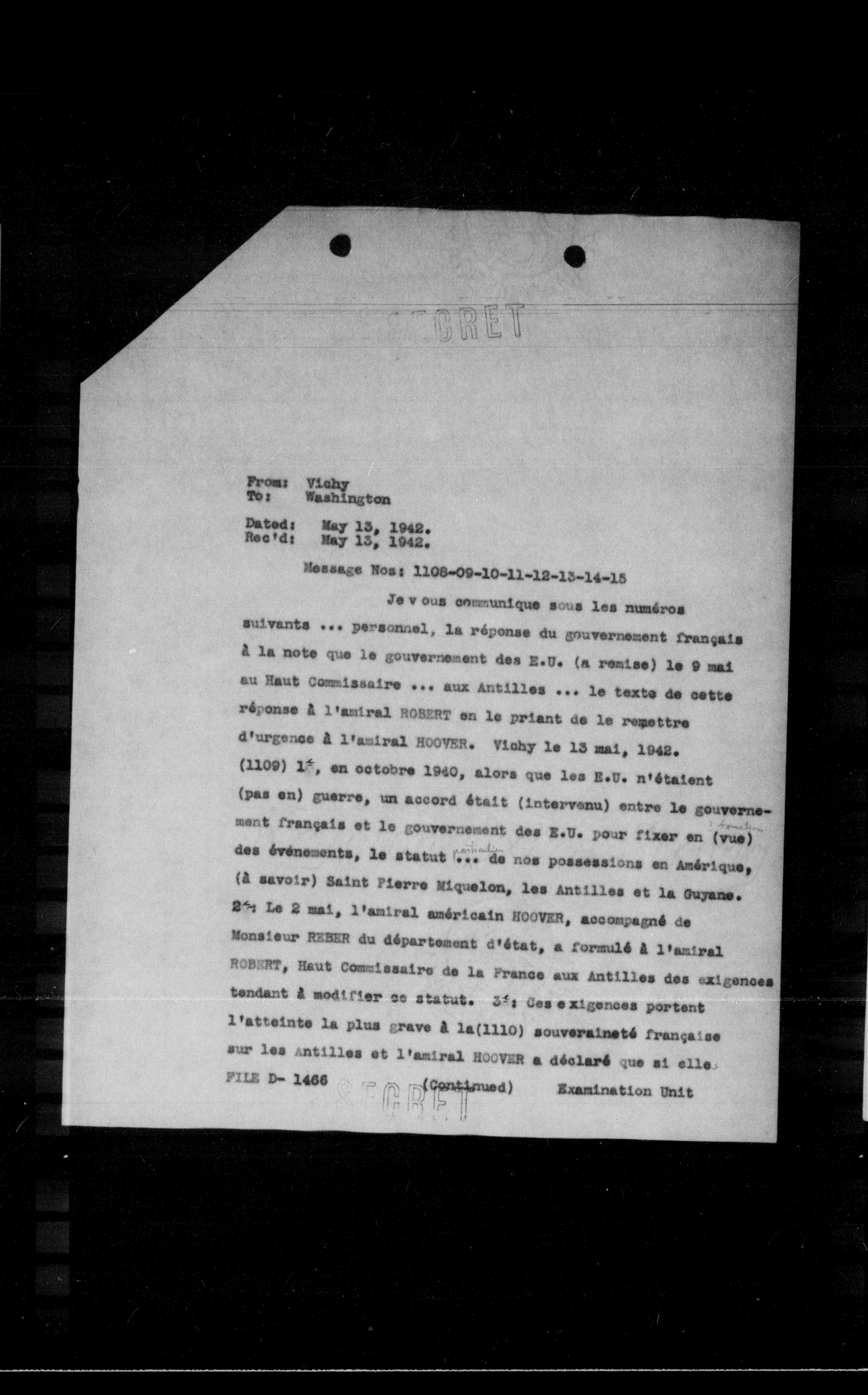d'urgence à l'amiral HOOVER. Vichy le 13 mai, 1942.