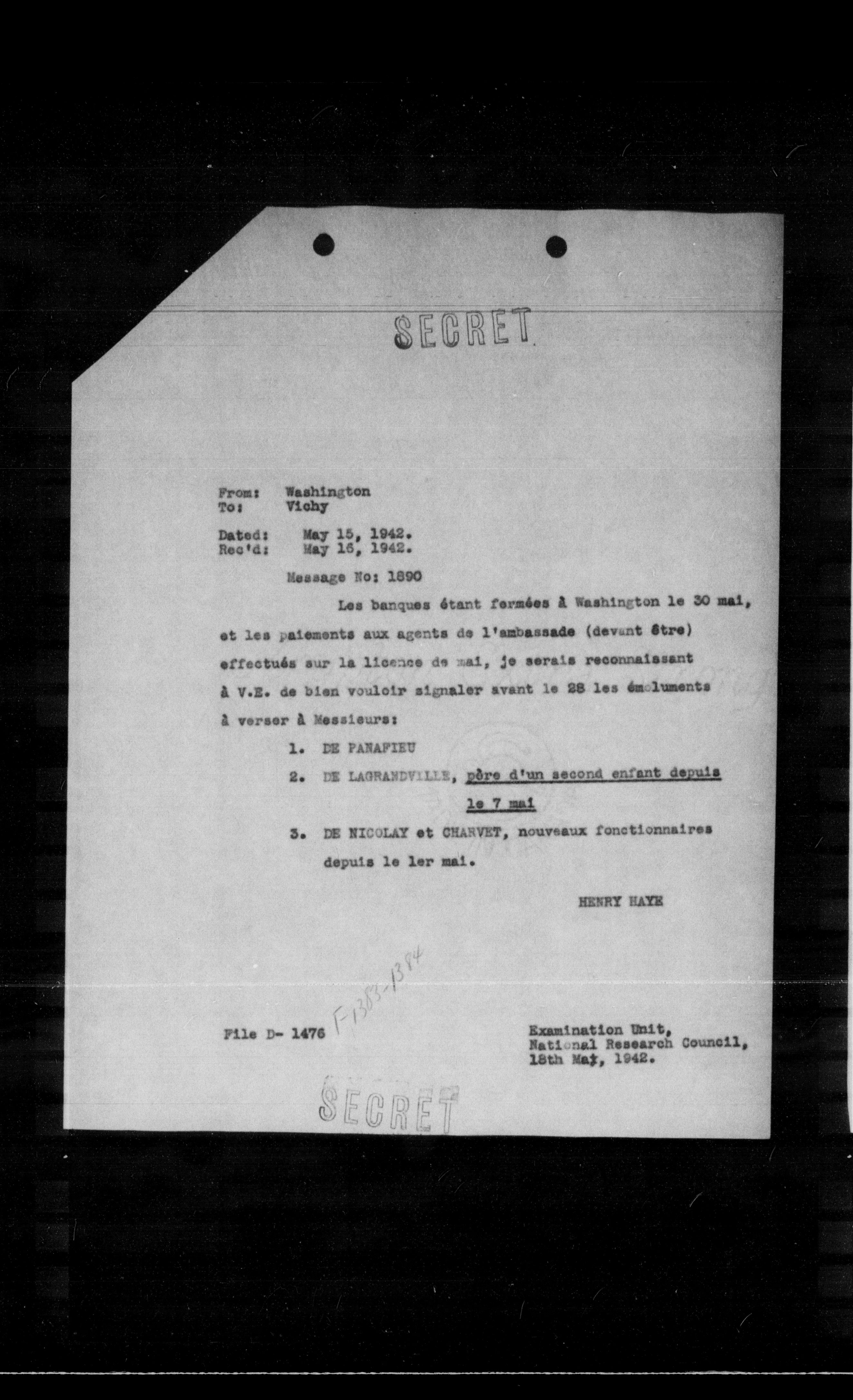 Les banques étant fermées à Washington le 30 mai, et les paiements aux agents de l'ambassade (devant être) effectués sur la licence de mai, je serais reconnaissant à V.E. de bien vouloir signaler avant le 28 les émoluments à verser à Messieurs: