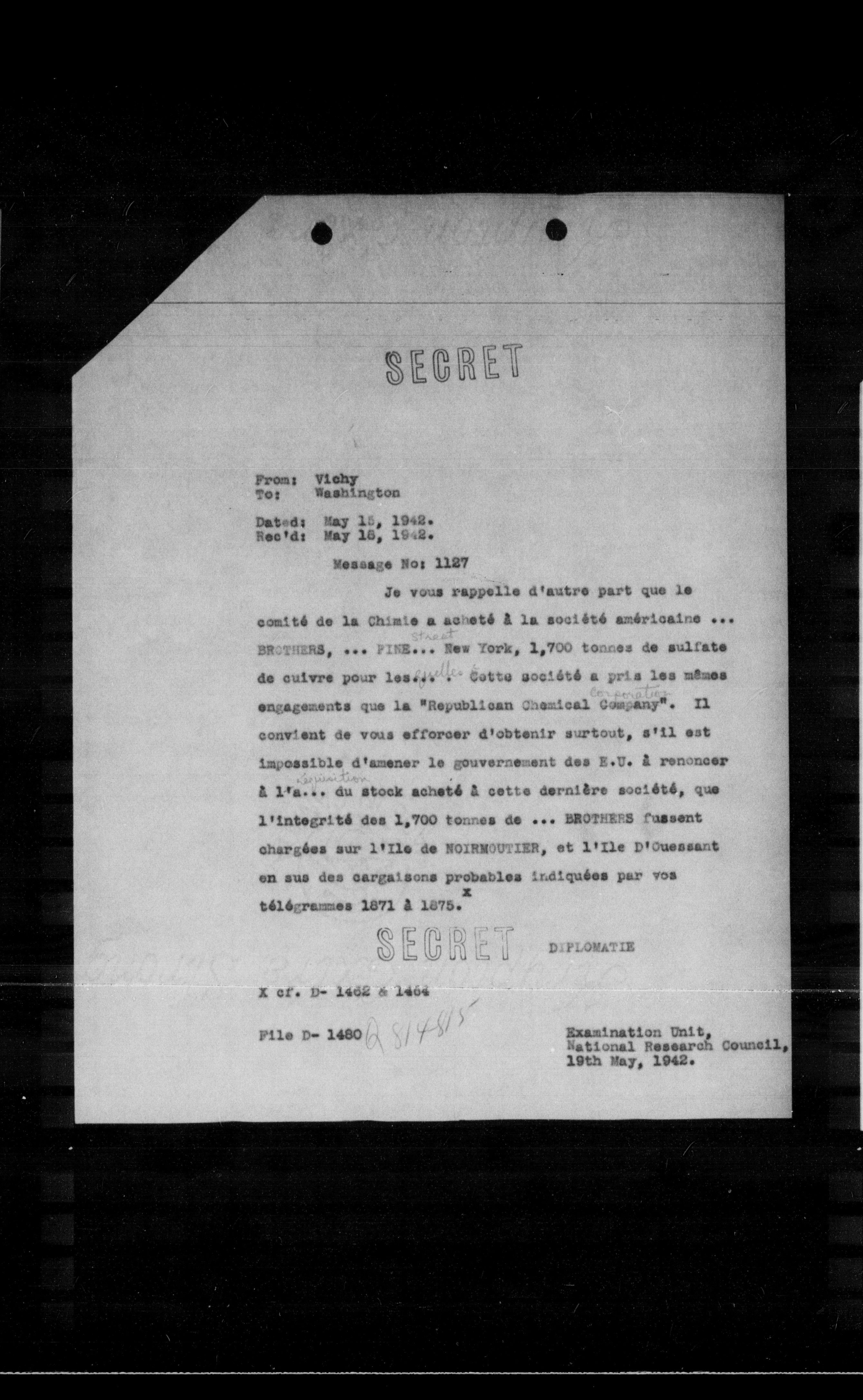 Je vous rappelle d'autre part que le comité de la Chimie a acheté la société américaine ... BROTHERS, ... FINE... New York, 1,700 tonnes de sulfate de cuivre pour les... Cette société a pris les mêmes engagements que la "Republican Chemical Company". Il convient de vous efforcer d'obtenir surtout, s'il est impossible d'amener le gouvernement des E.U. à renoncer à l'a... du stock acheté cette dernière société, que l'integrité des 1,700 tonnes de ... BROTHERS fussent chargées sur l'île de NOIRMOUTIER, et l'île D'Ouessant en sus des cargaisons probables indiquées par vos télégrammes 1871 à 1875.