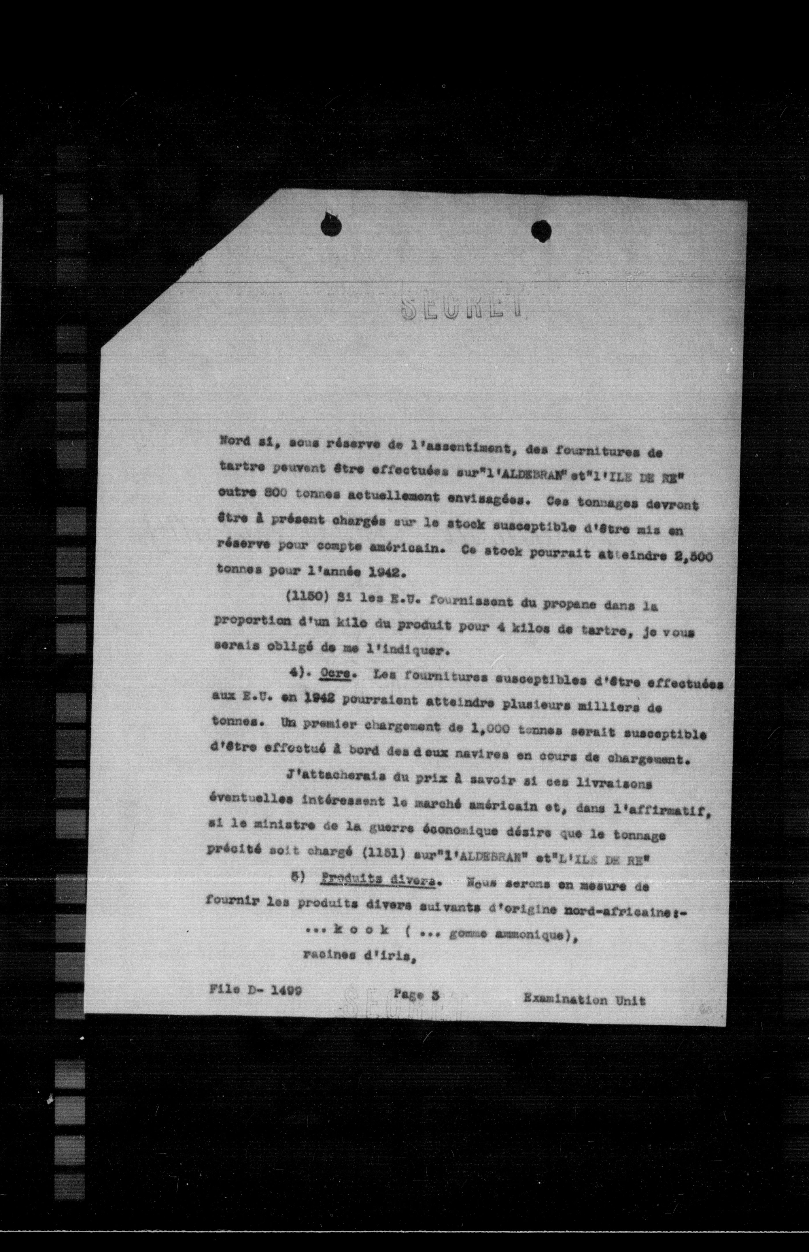 4). Gors. Les fournitures susceptibles d'être effectuées aux E.U. en 1942 pourraient atteindre plusieurs milliers de tonnes. Un premier chargement de 1,000 tonnes serait susceptible d'être effostué à bord des deux navires en cours de chargement. J'attacherais du prix à savoir si ces livraisons éventuelles intéressent le marché américain et, dans l'affirmatif, si le ministre de la guerre économique désire que le tonnage précité soit chargé (1151) sur"1'ALDEBRAN" et"L'ILE DE RE"