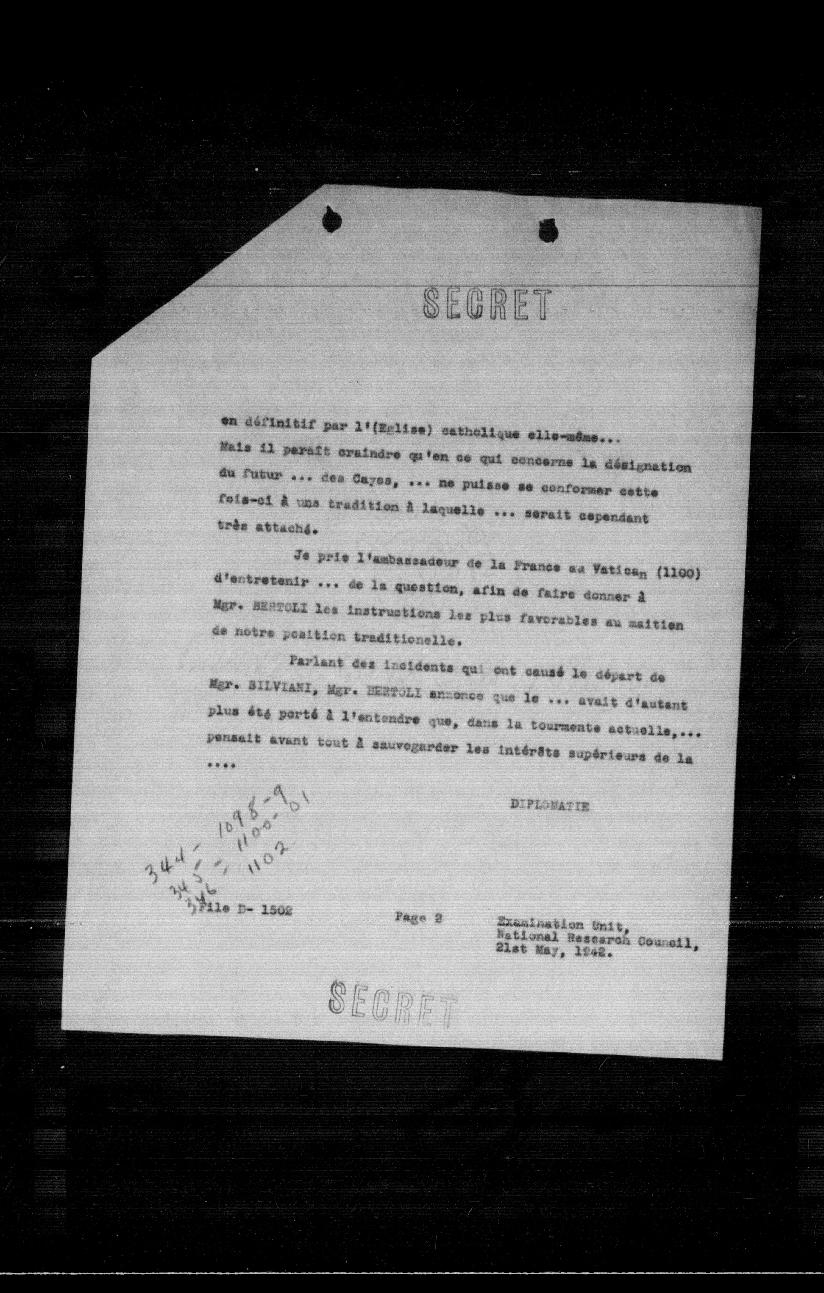 Je prie l'ambassadeur de la France au Vatican (1100) d'entretenir ... de la question, afin de faire donner a Mgr. BERTOLI les instructions les plus favorables au maition de notre position traditionelle.