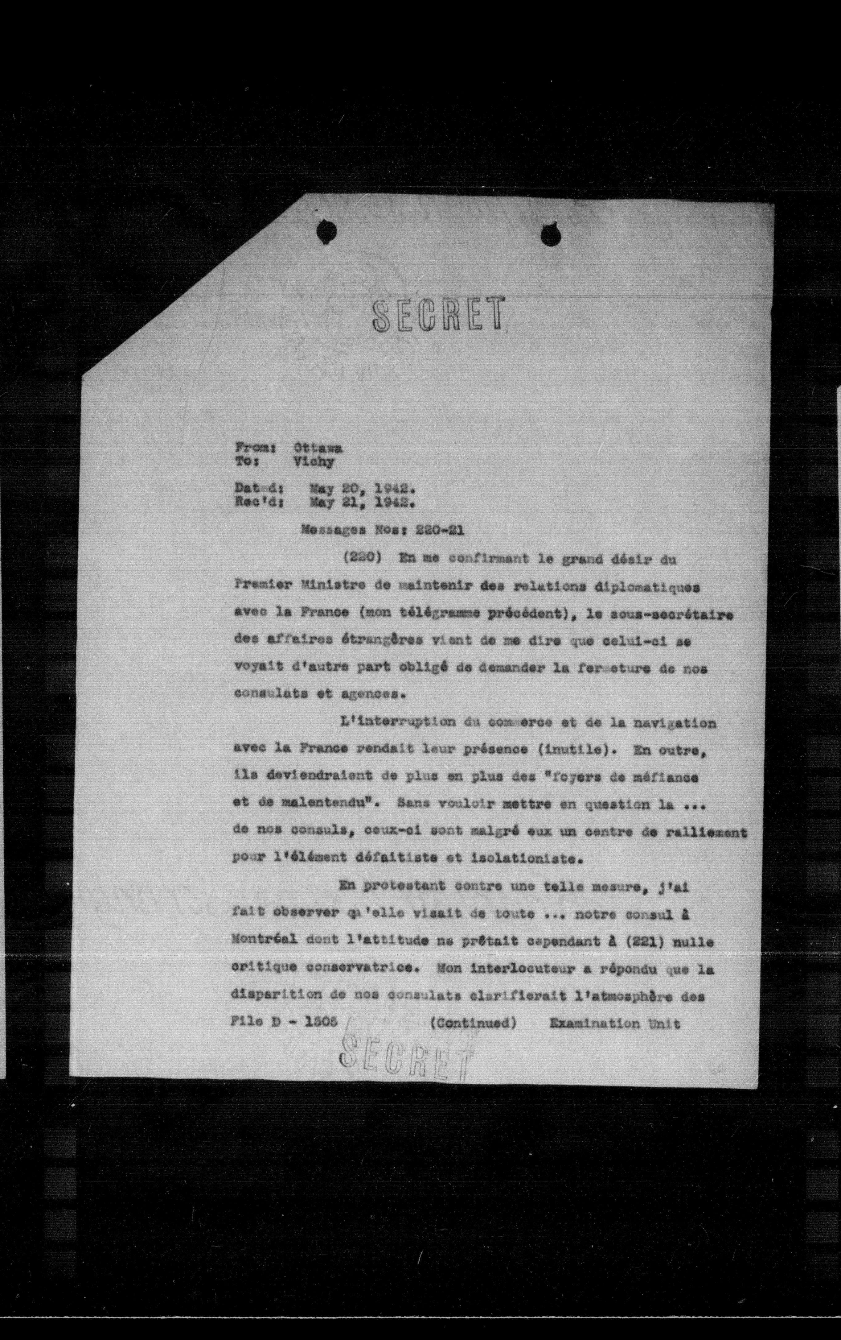 En protestant contre une telle mesure, j'ai fait observer qu'elle visait de toute ... notre consul a Montréal dont l'attitude ne prôta1t cependant a (221) nulle oritique conservatrice. Mon interlocuteur a répondu que la disparition de nos consulats clarifierait l'atmosphère des File D - 1505