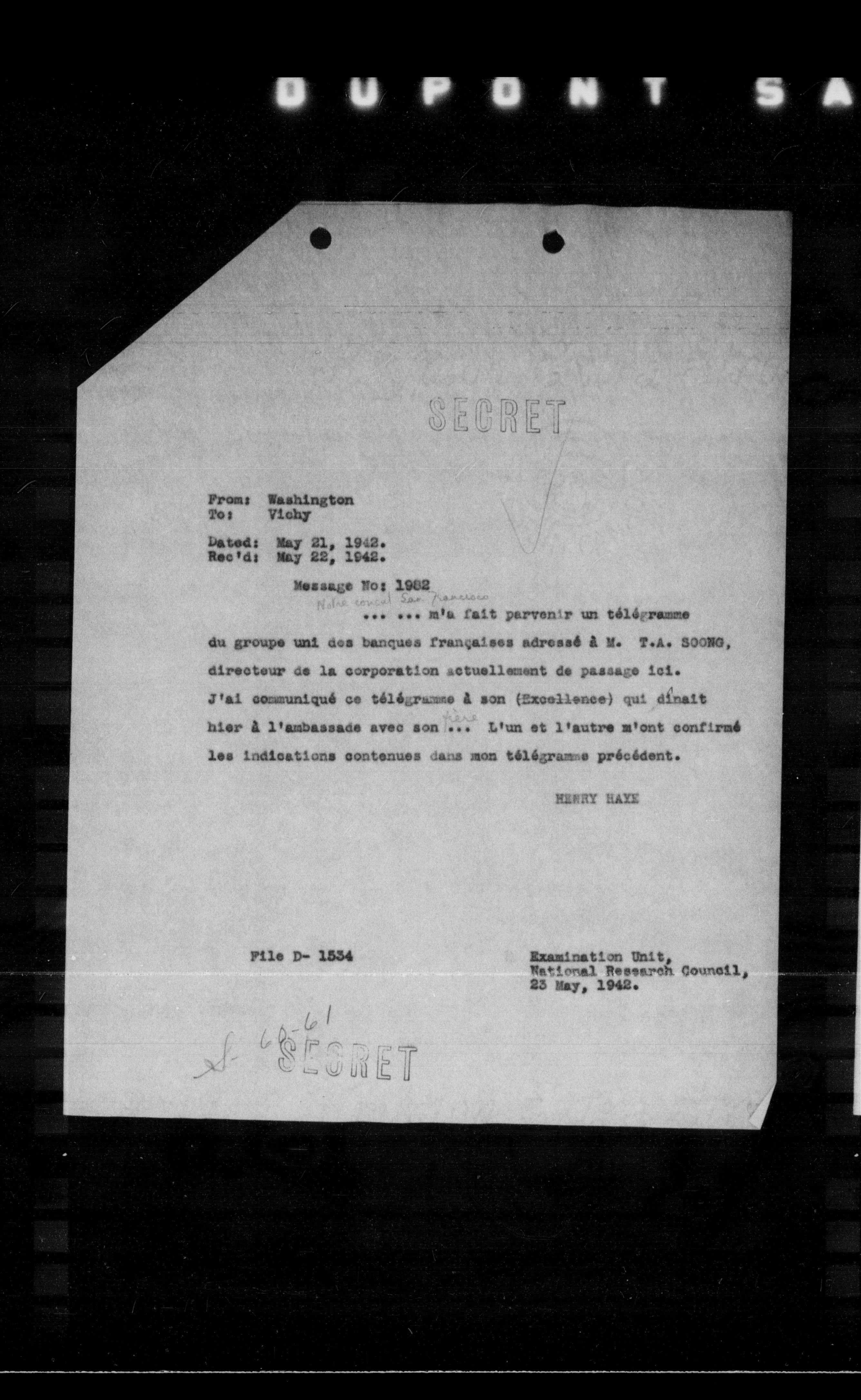 du groupe uni des banques françaises adressé à M. T.A. SOONG, directeur de la corporation actuellement de passage ici. J'ai communiqué ce télégramme à son (Excellence) qui dînait hier à l'ambassade avec son ... L'un et l'autre m'ont confirmé les indications contenues dans mon télégramme précédent.